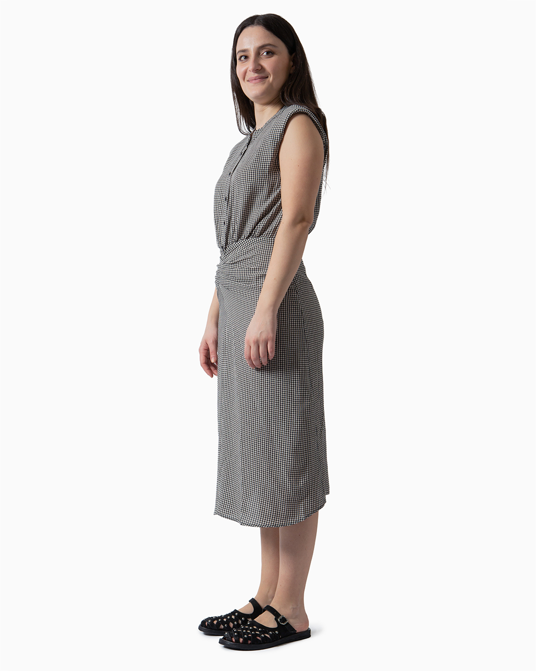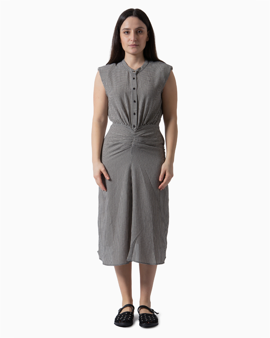 Abito midi girocollo con spalle strutturate senza maniche.