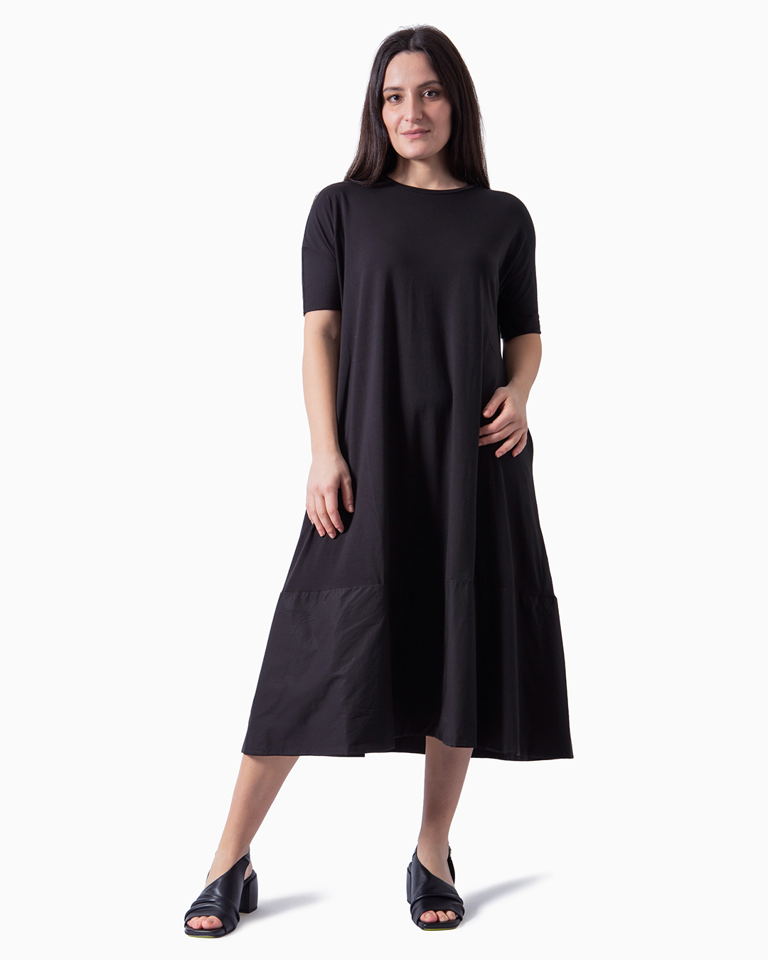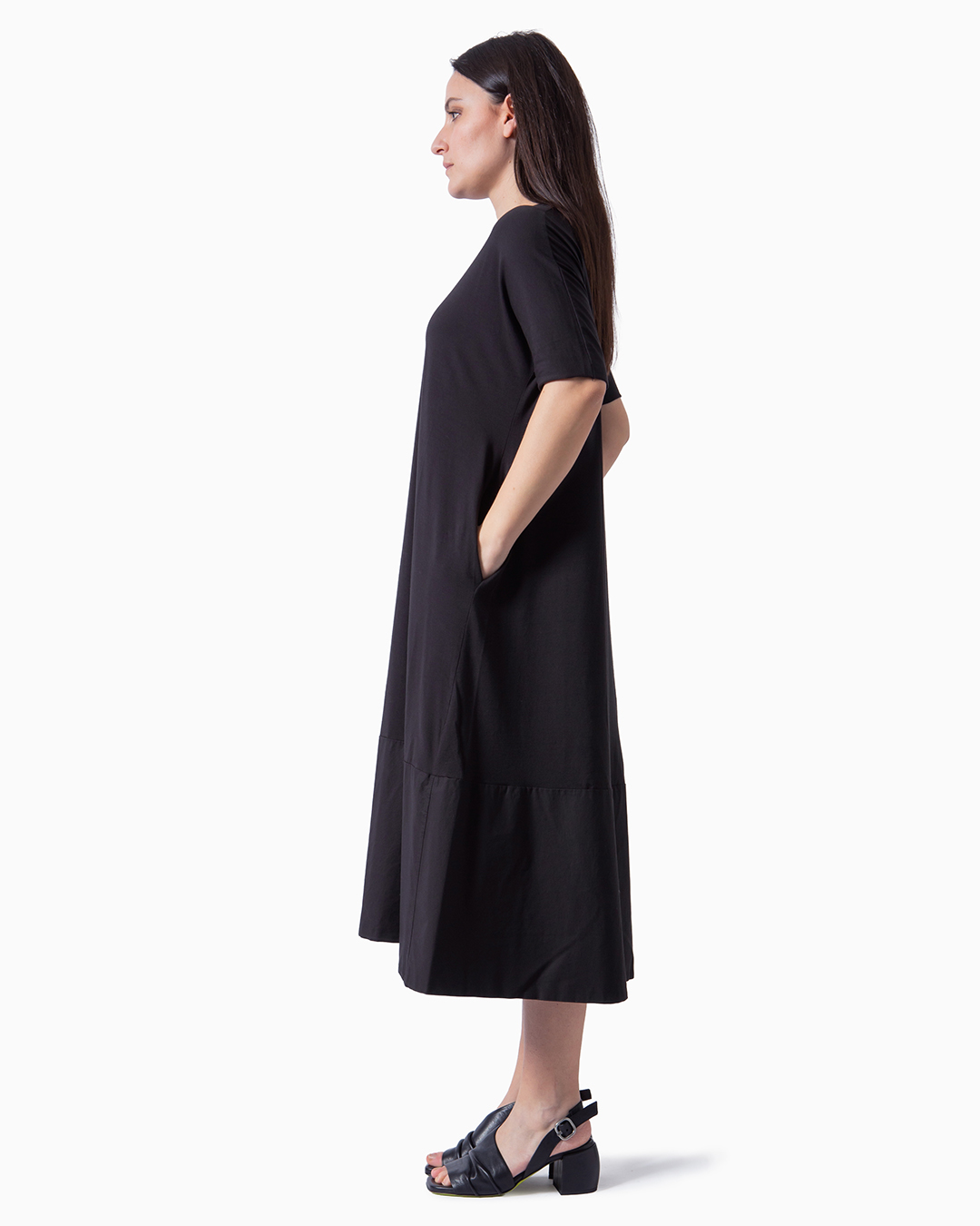 Abito con maniche corte e tasche laterali. Linea morbida e dritta. Tinto in capo artigianalmente. Composizione: 94% cotone, 6% elastan.