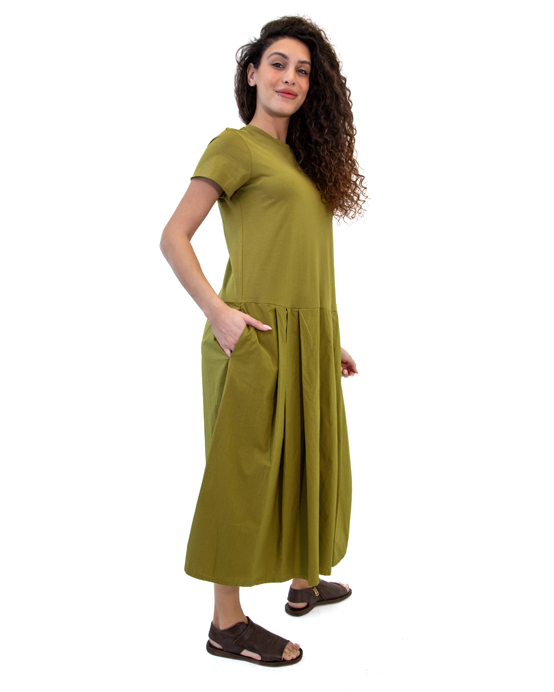 Abito midi girocollo doppio tessuto, jersey e solo la gonna a pieghe รฉ realizzata in popeline. Mezza manica con taglio vivo. Vestibilita morbida. Colore: Verdone. Composizione: 100% cotone. Produzione artigianale italiana. Made in Italy.
