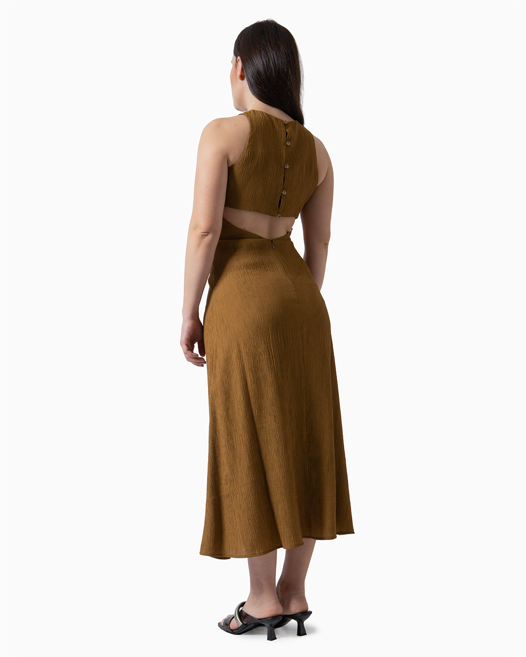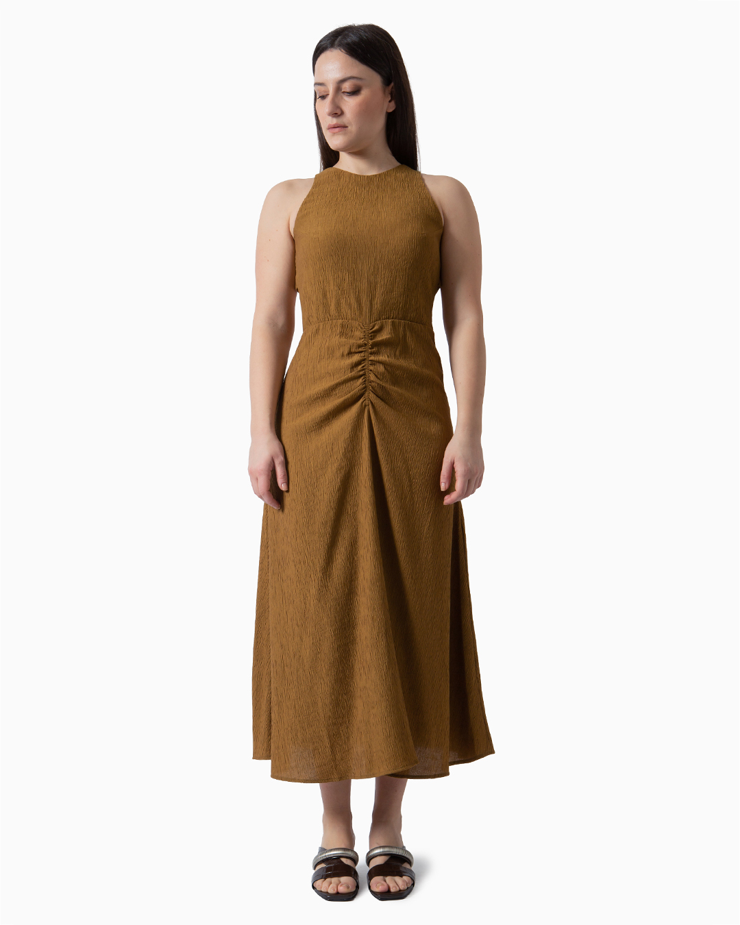 Mini abito senza maniche, arricciato in vita e con schiena scoperta.