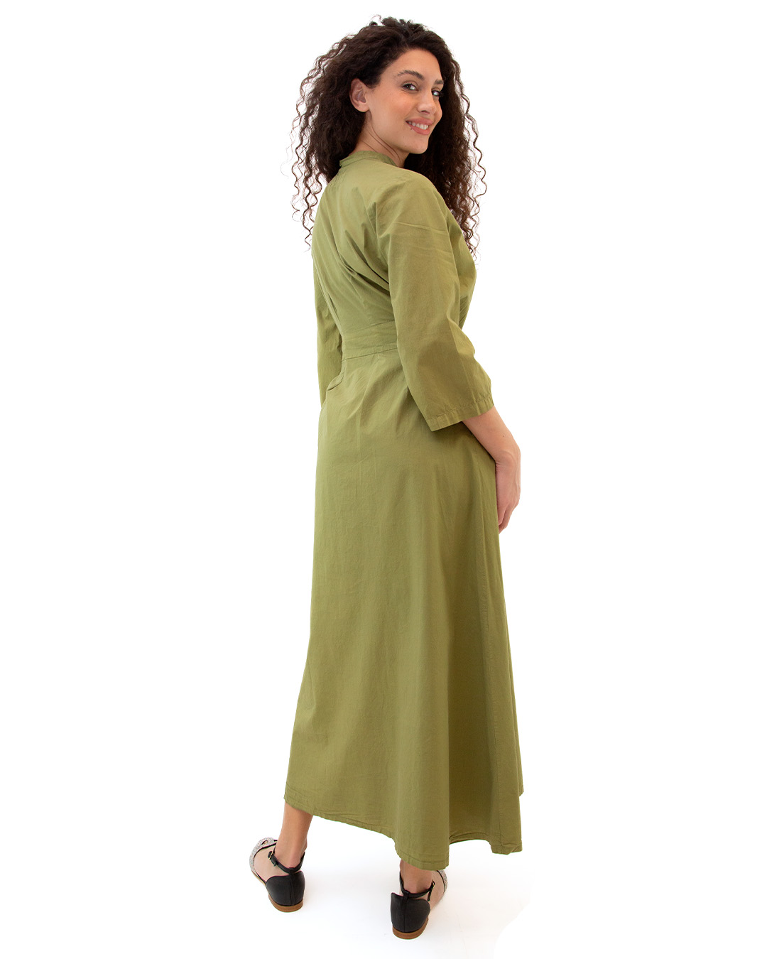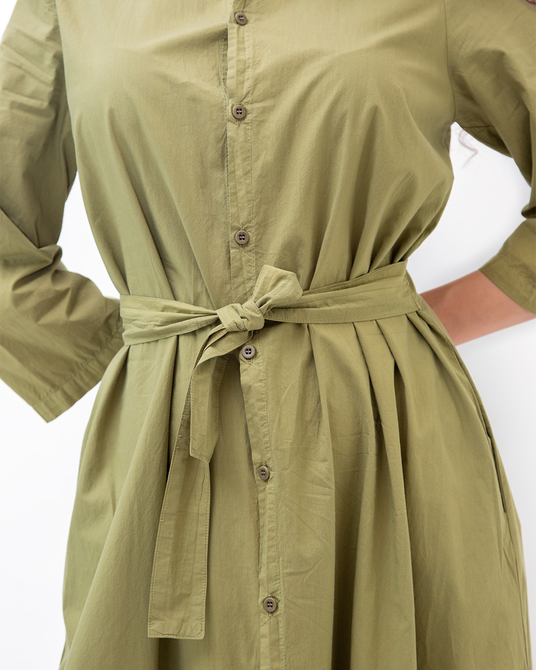 Abito chemisier lungo con abbottonatura. Manica lunga e cintura dello stesso tessuto applicata in vitta. Collo alla coreana. Colore: Verdone. Tessuto: polpeline. Composizione: 100% cotone. Produzione artigianale italiana. Made in Italy.