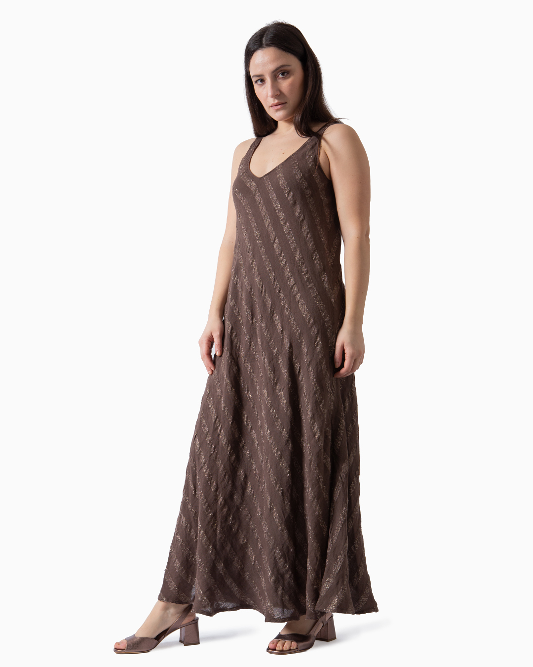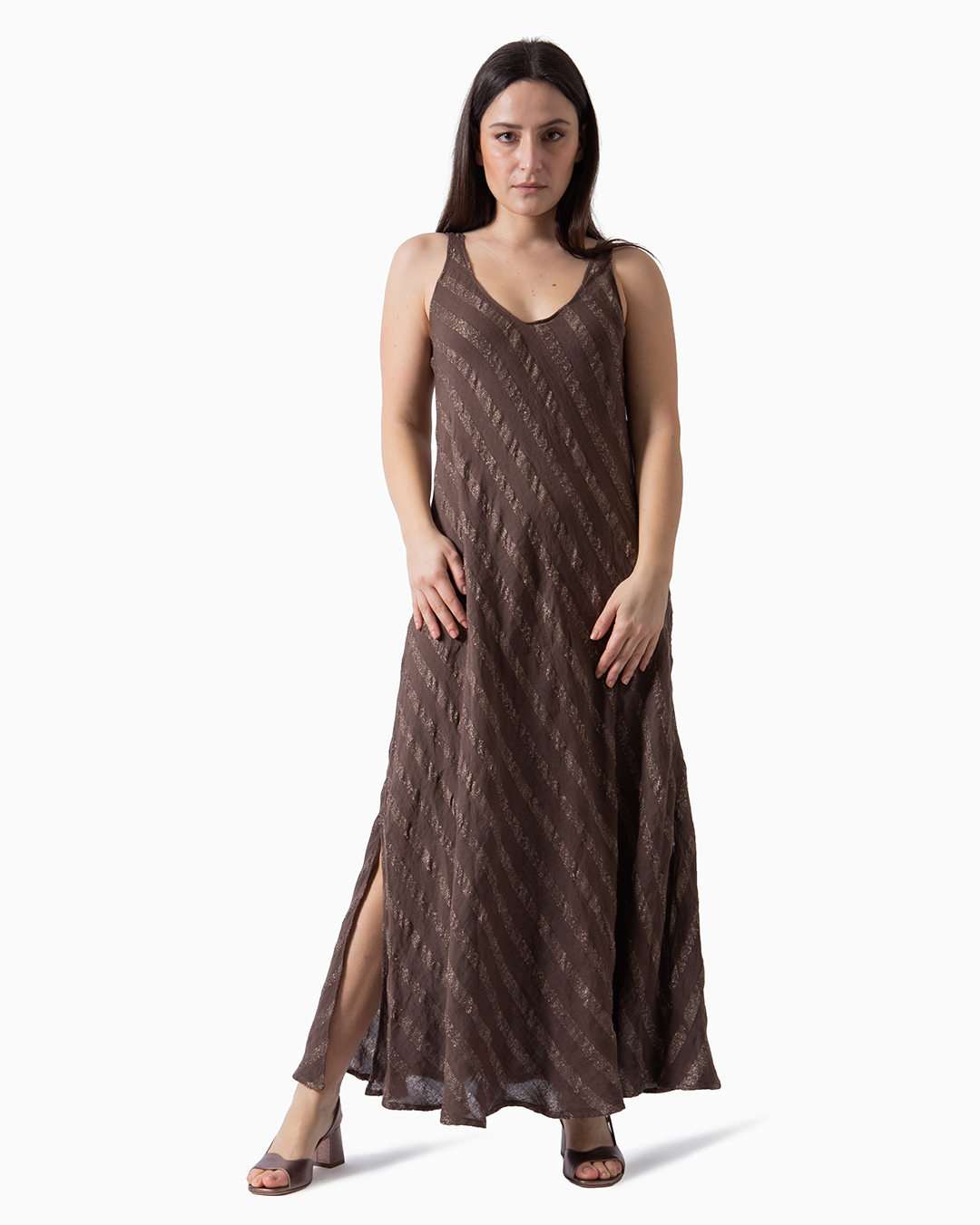 Abito realizzato in lino 100% naturale, un tessuto leggero, traspirante e biodegradabile. La forma triangolare e svasata del capo crea una linea fluida che si adatta al corpo con naturalezza. Made in Italy.