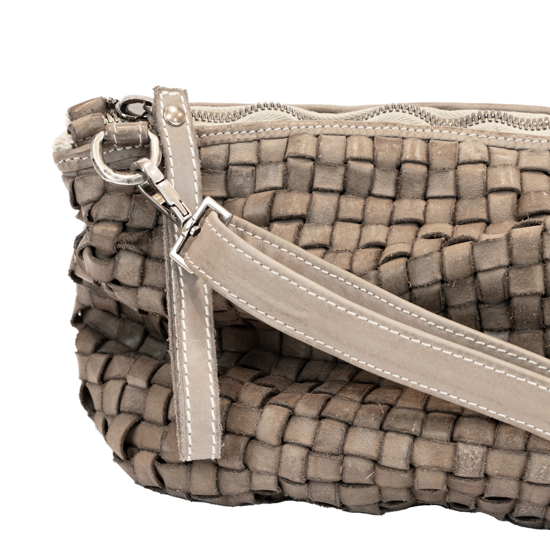 Borsa in pelle intrecciata color fango.