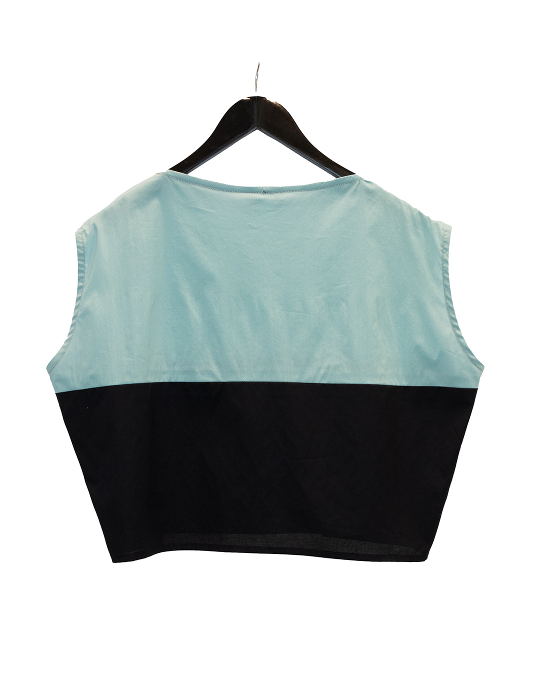 Blusa bicolore verde acqua e nero. Scollo a giro ampio. Composizione: 100% cotone. Produzione artigianale italiana.