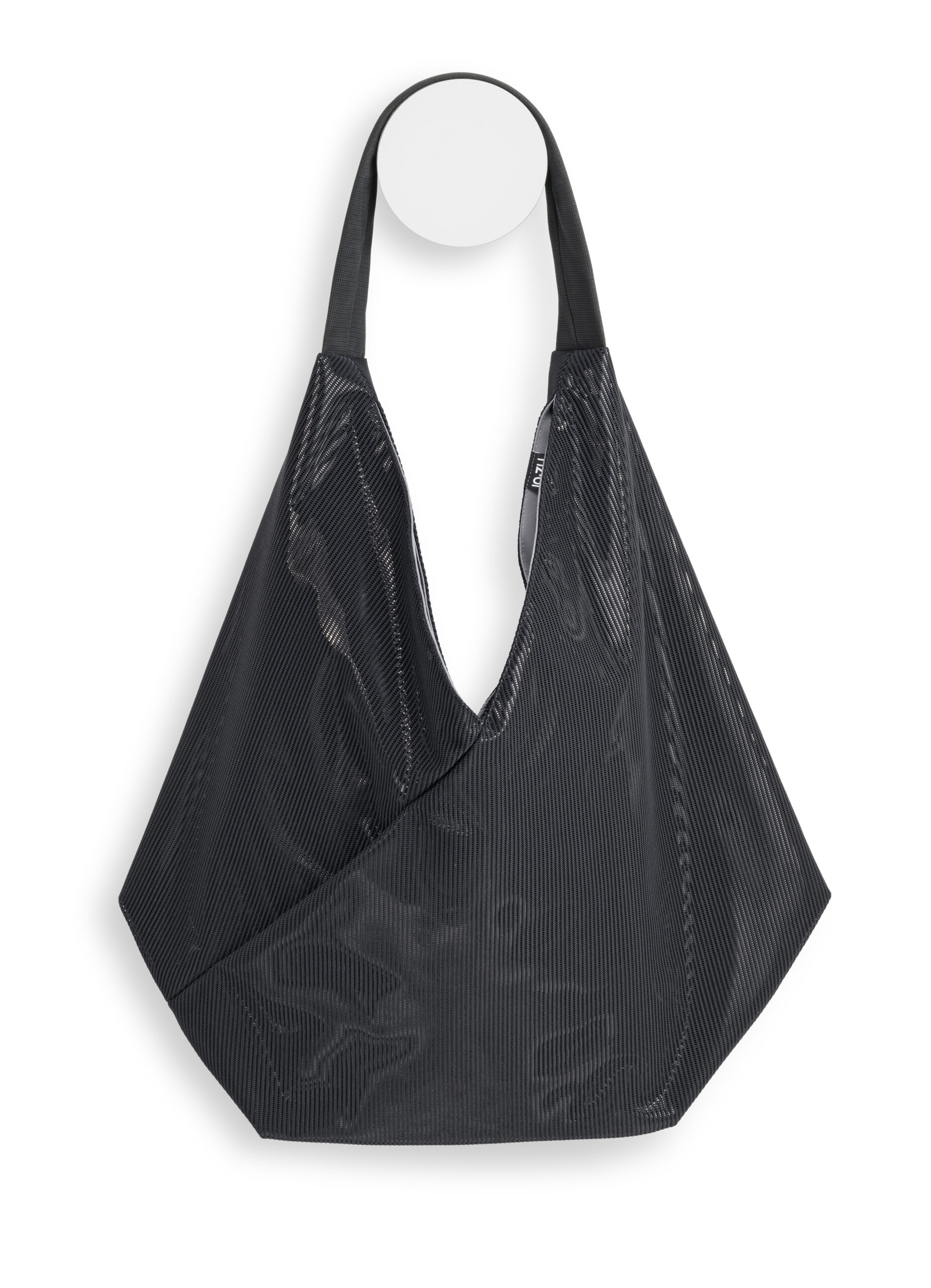 La borsa a spalla Bevel Bag rappresenta audacia e sperimentazione nei materiali, con attenzione ai dettagli.