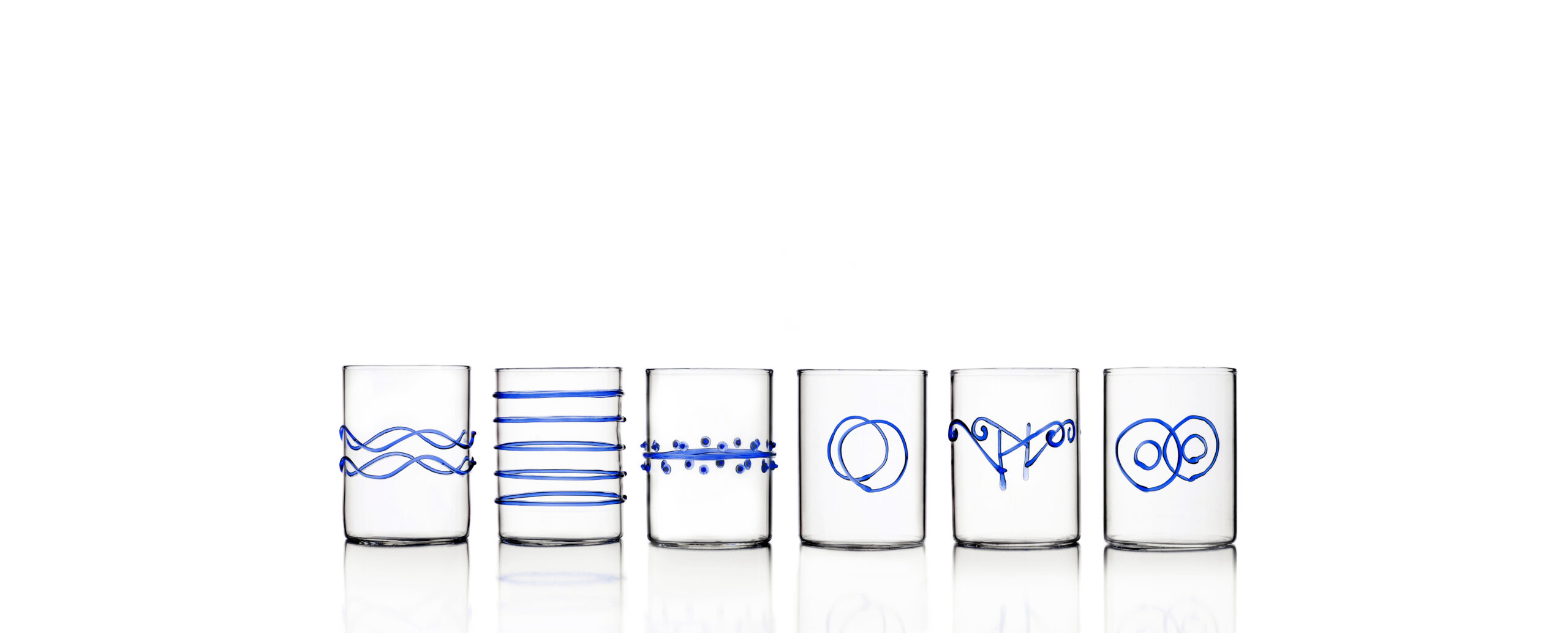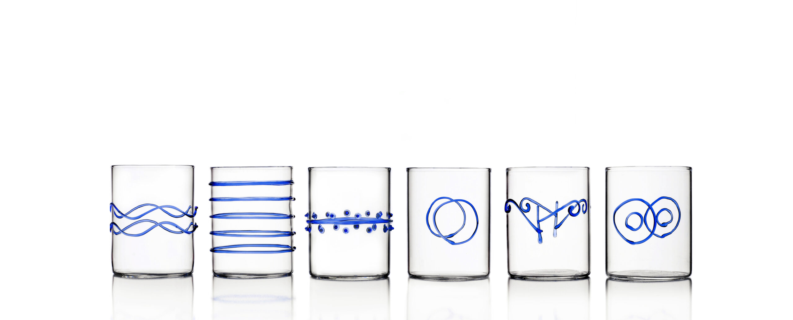 Bicchieri realizzati a mano e modellati a lume con vetro borosilicato. Dimensioni: H 9,2 – DIAM 7,1. Ichendorf Milano.
