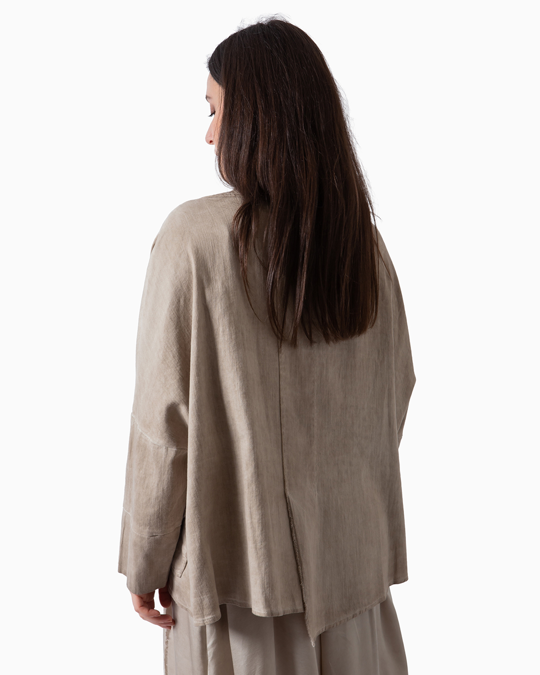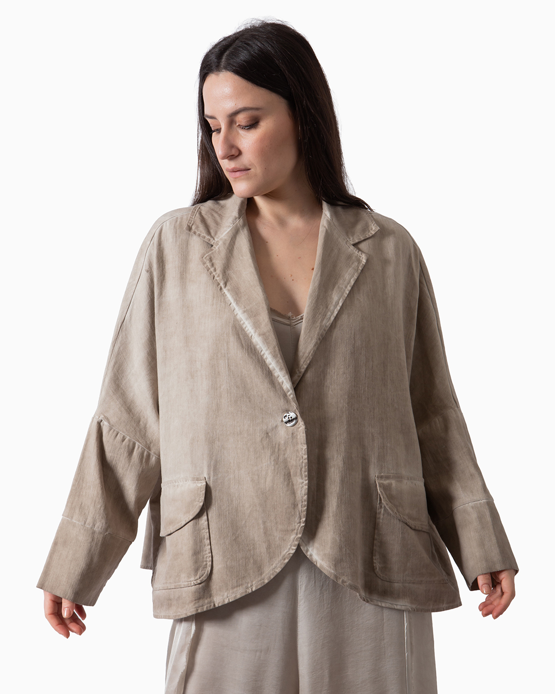 Blazer Over in gabardina di puro cotone operata. Tasche a toppa e chiusura con bottone gioiello. Made in Italy.