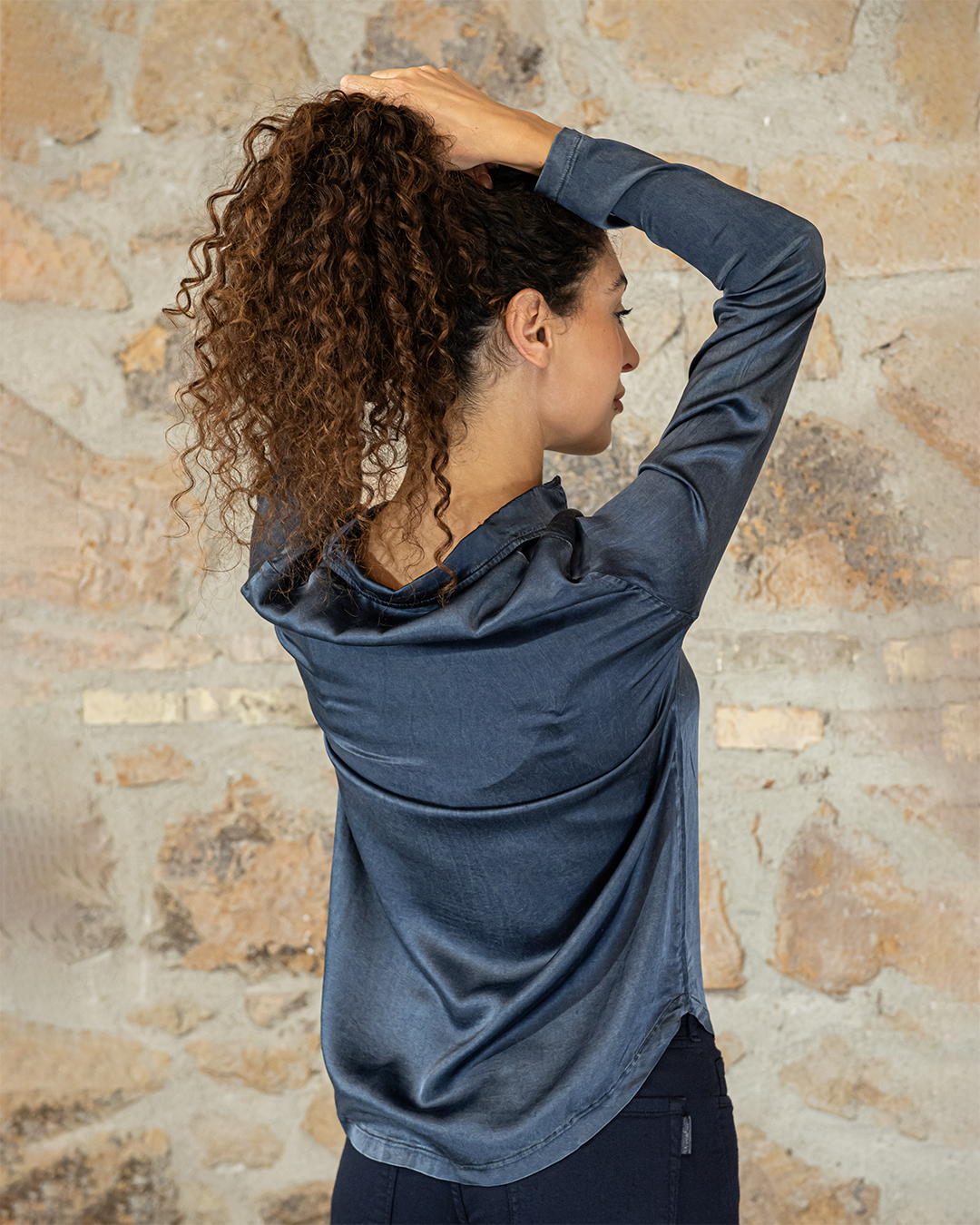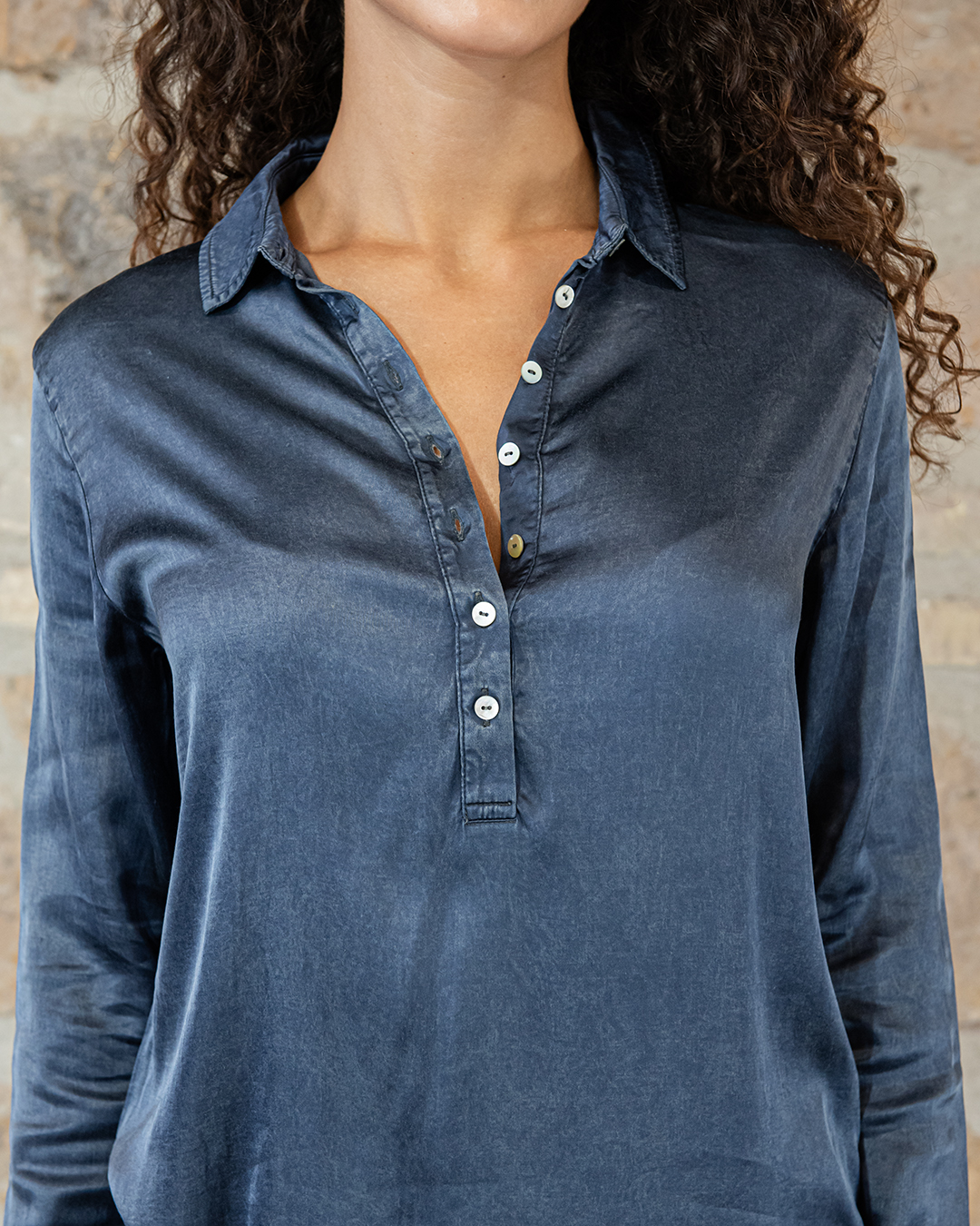 Blusa, scollo polo con bottoncini in madreperla.