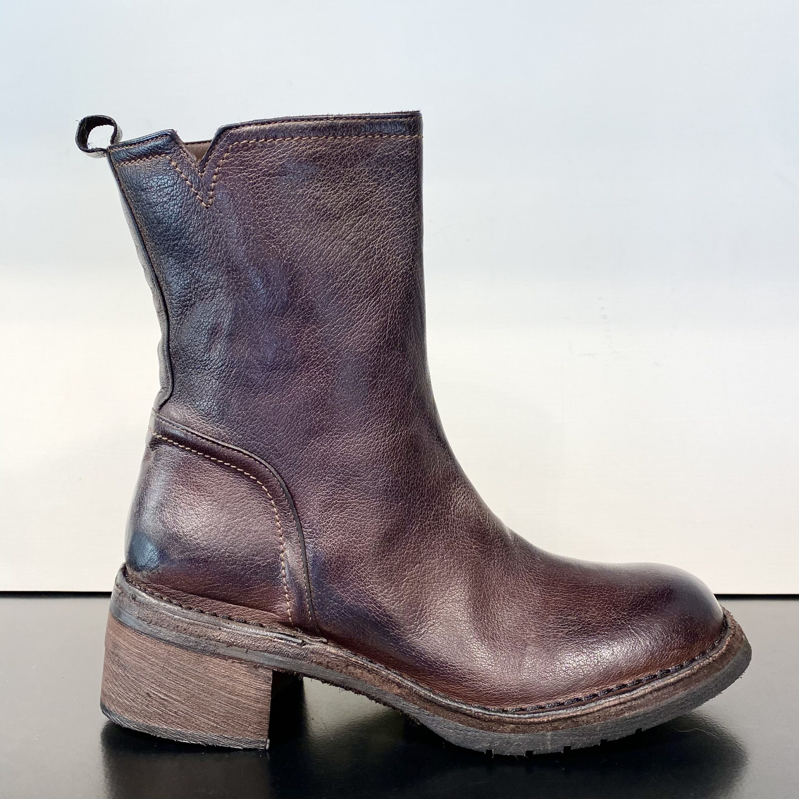 Tomaia esterna in pelle leggermente martellata. Tomaia interna in pelle. Suolettino interno in pelle imbottita. Suola esterna in cuoio con mezza suola in gomma antiscivolo. Zip lato interno. Tacco alto 5 cm. Made in Italy.