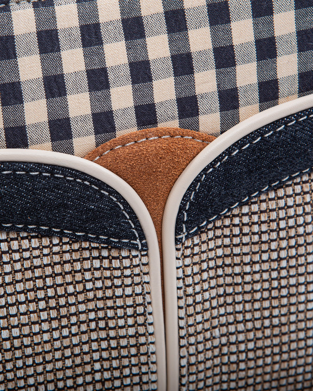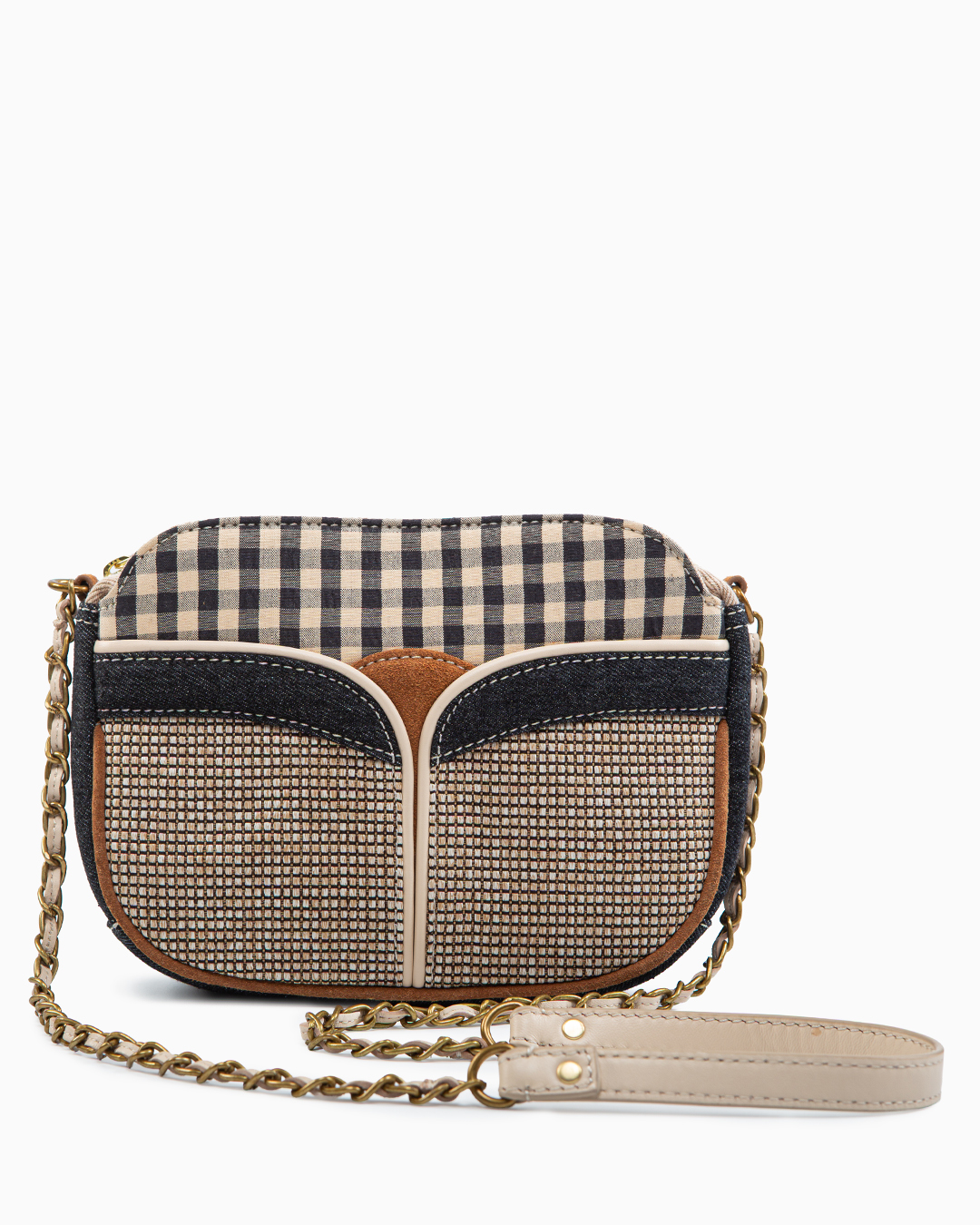 Borsa in mix di materiali in denim e tela di cotone, con inserti tessili fantasia.