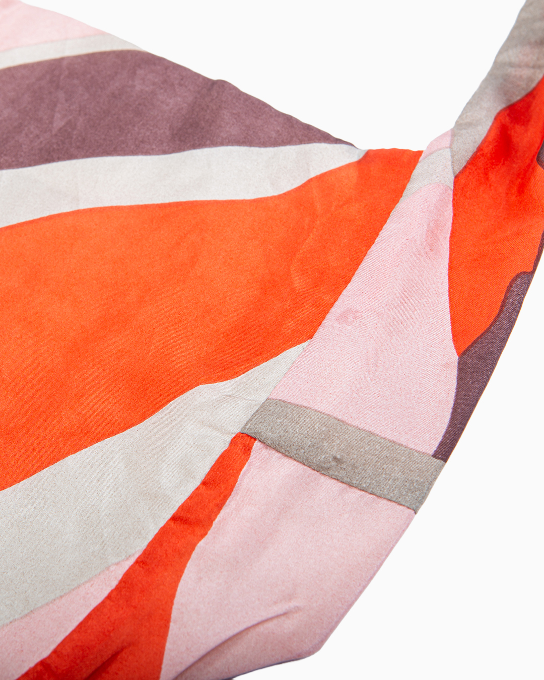 Borsa dipinta a mano in seta. Chiusura con bottone metallico. Medie dimensioni: 37x37x6 cm. Tasca interna con zip. Designed in France.