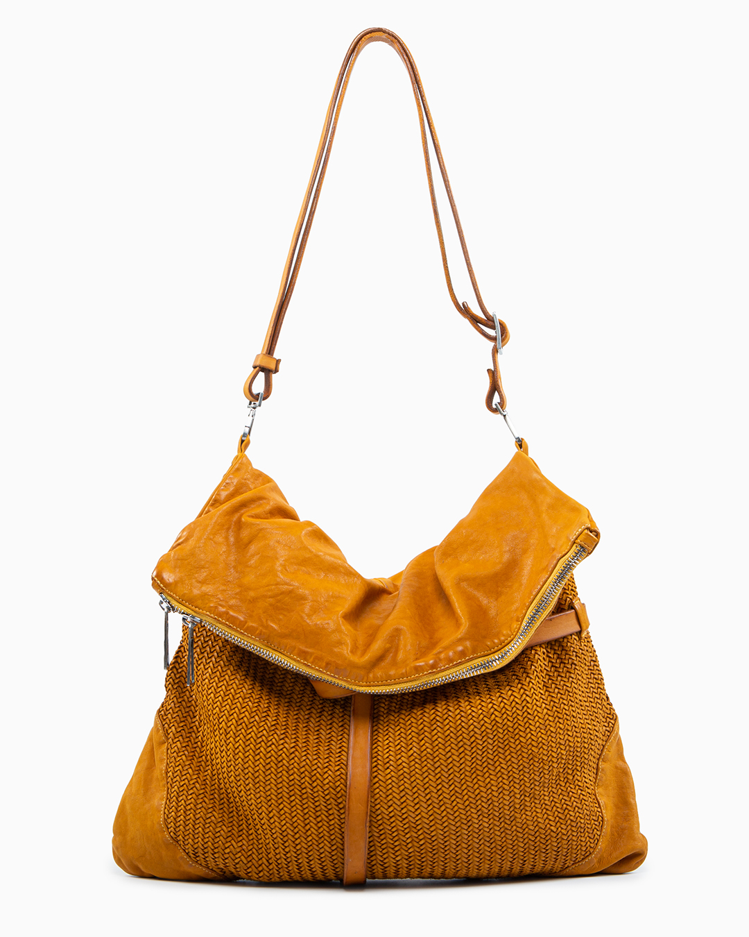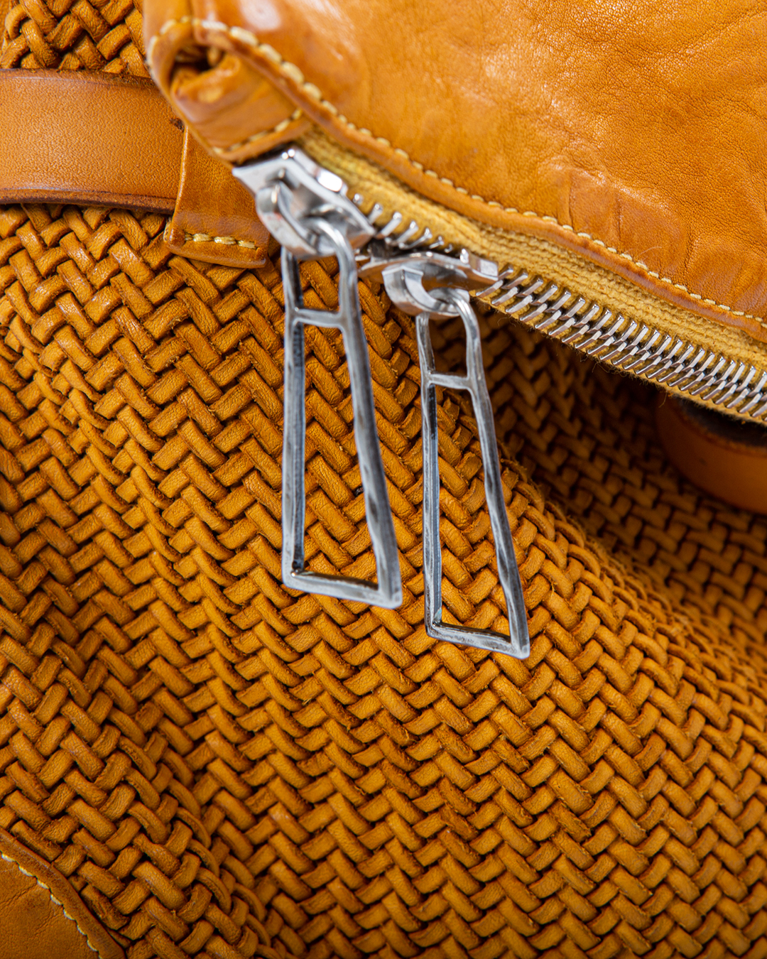Borsa realizzata in pelle conciata al vegetale, una tecnica di tintura in botte a capo finito.
