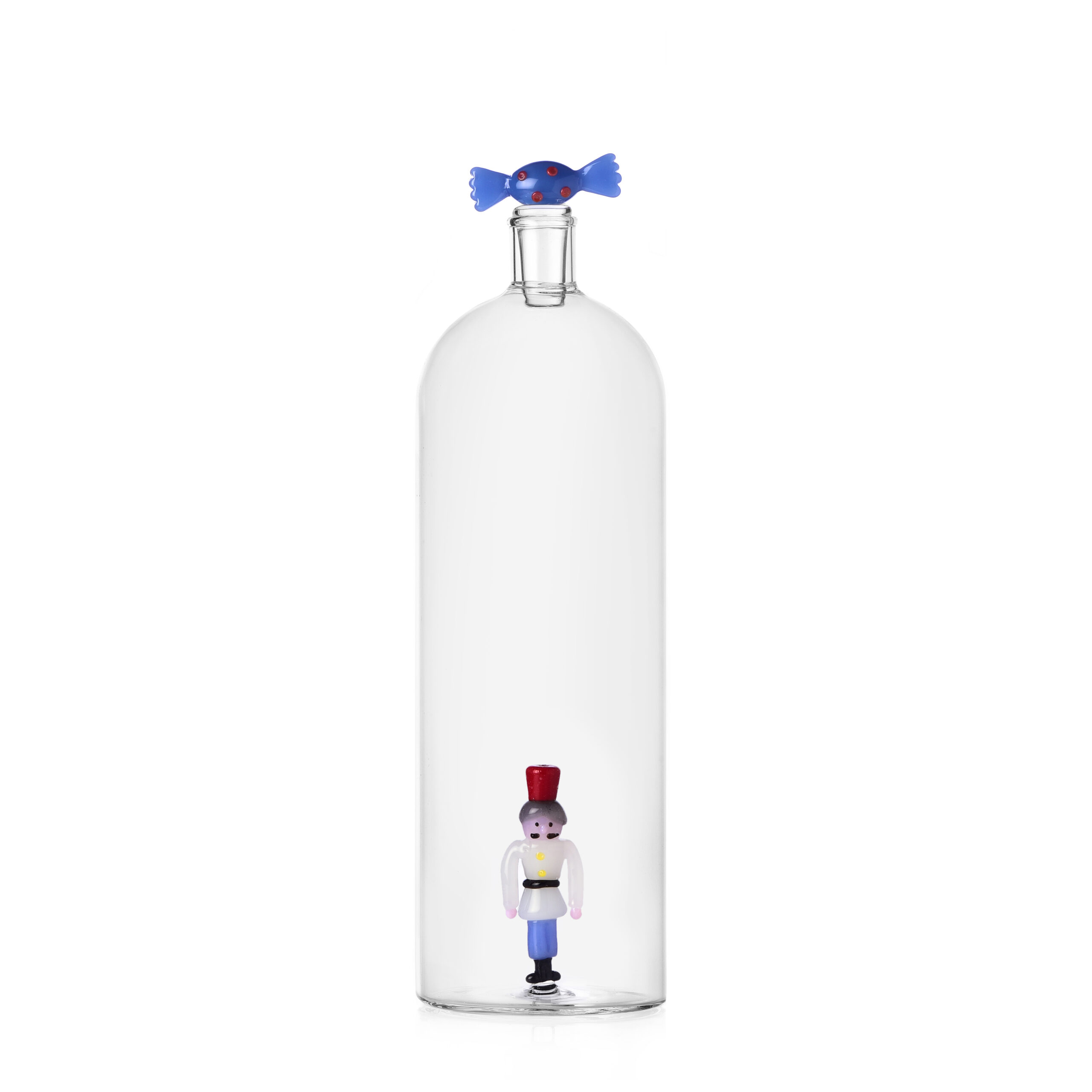 Bottiglia in vetro con tappo removibile a forma di caramella. Altezza 29 cm, diametro 8,5 cm. Ichendorf Milano.