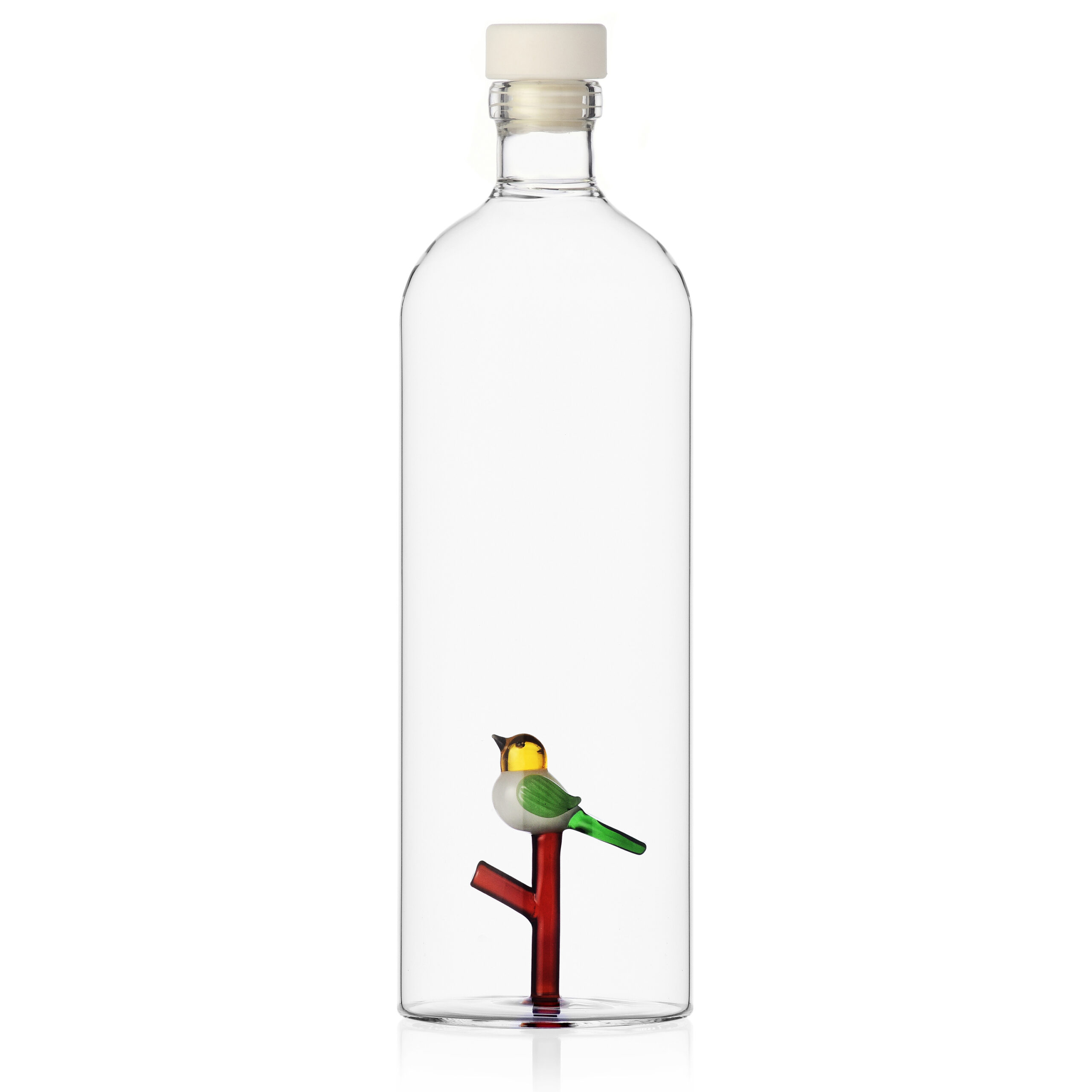 Bottiglia trasparente con tappo bianco con uccellino colorato. Realizzata in vetro borosilicato. Dimensioni: H 25,5+1,5(tappo) – DIAM 8,5. Ichendorf Milano.