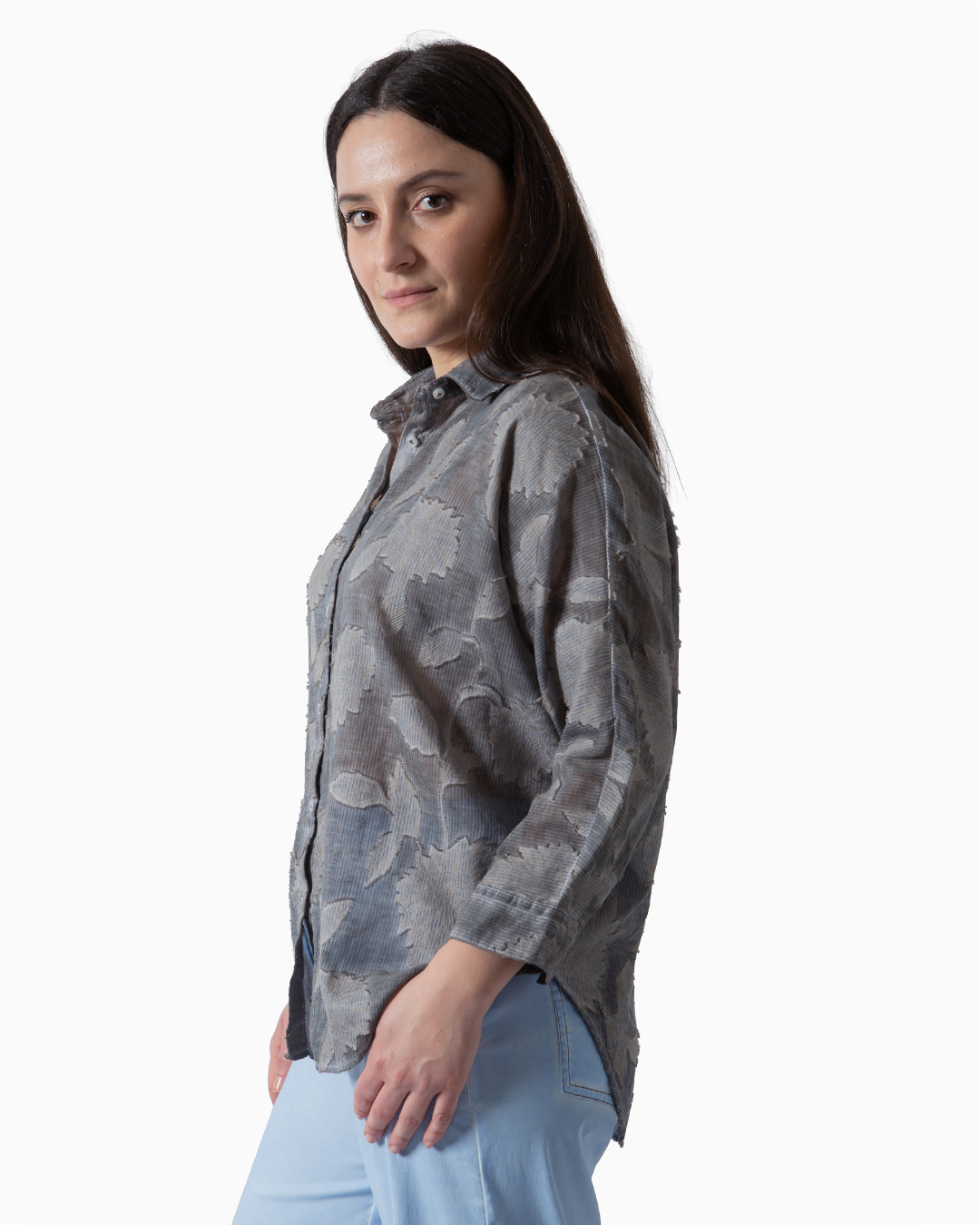 Tessuto lavorato con motivo a fiori e righe a contrasto.