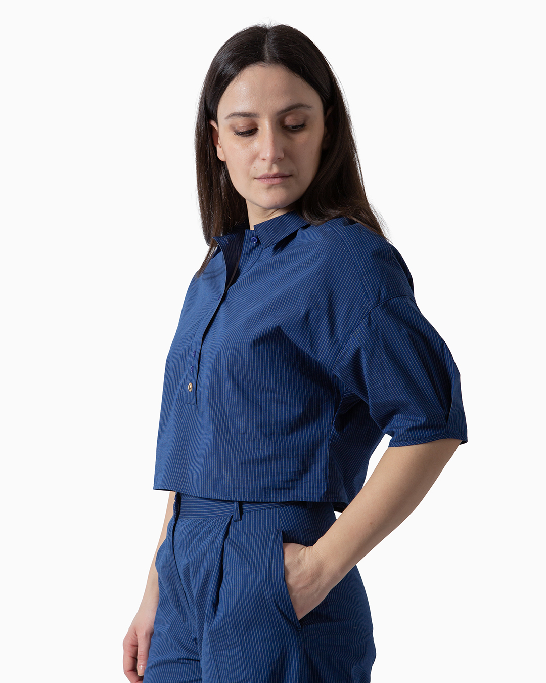Camicia corta a maniche corte realizzata in popeline a righe sottili.