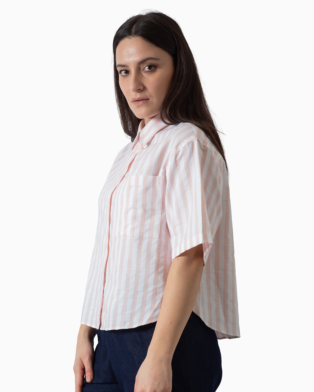 Camicia sartoriale a maniche corte con impunture a quadri. Dettaglio tasca a toppa laterale. Composizione: 78% cotone, 22% poliestere. Made in Italy.