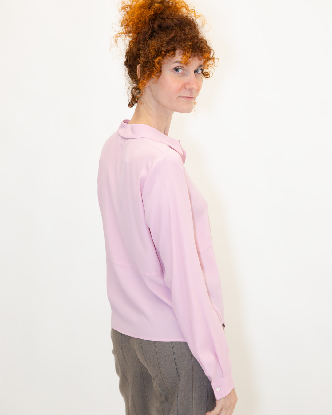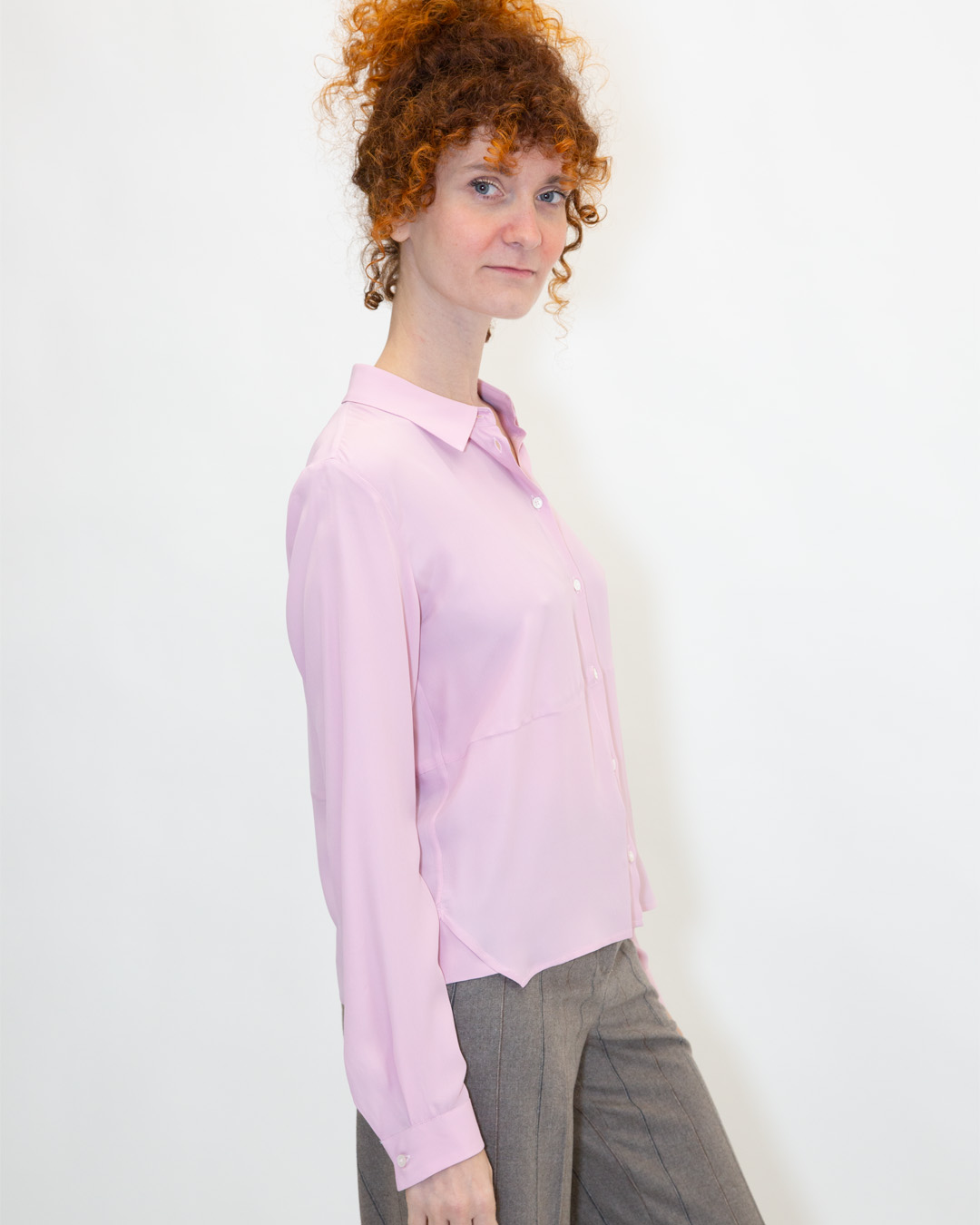Camicia con collo a revers e maniche lunghe con polsino. Chiusura frontale con bottoni. Dettaglio cucitura orizzontale. Composizione: 72% Acetato, 28% Seta. Made in Italy.