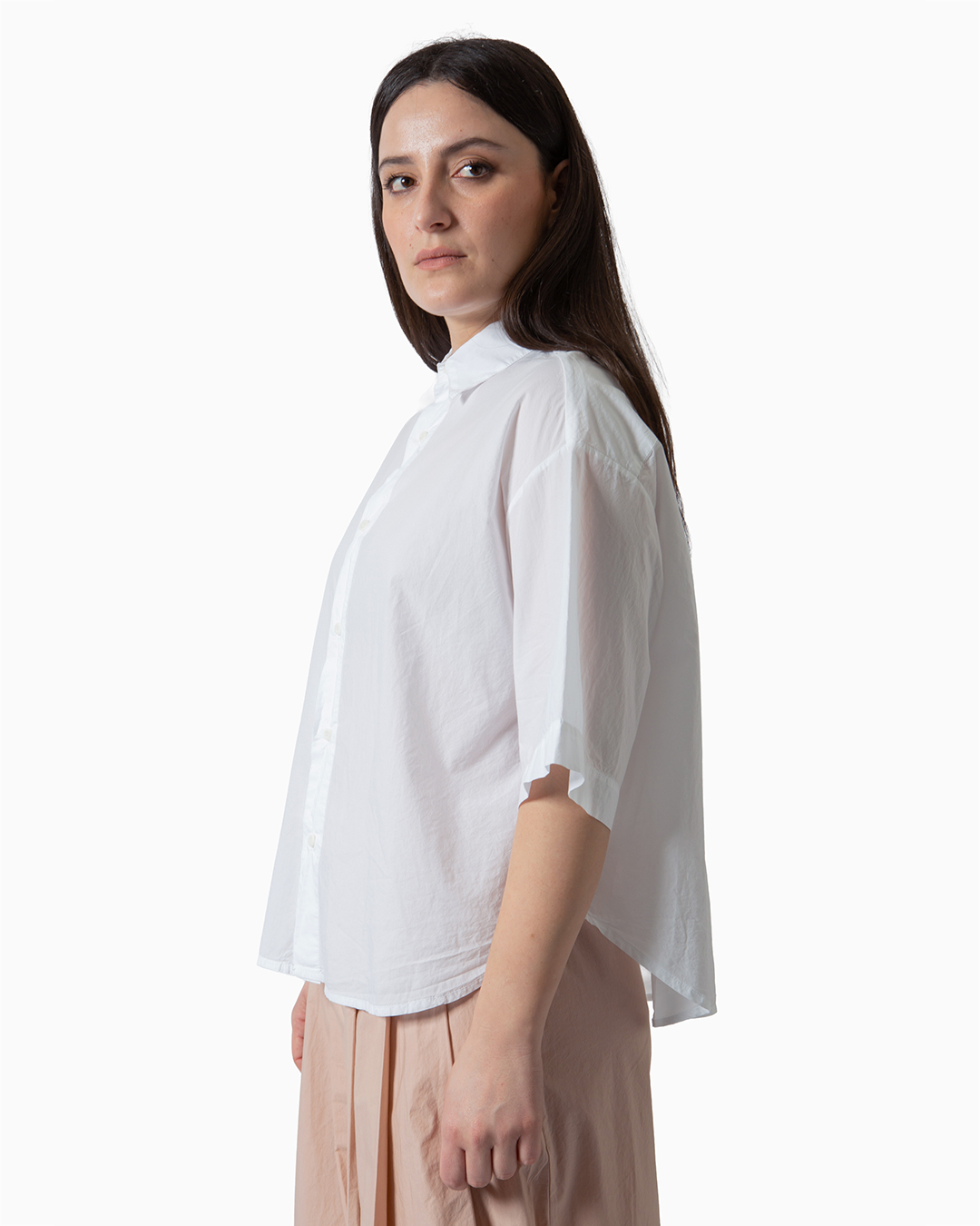 Camicia a maniche corte leggermente oversize. Maniche ampie e colletto a polo in leggero popeline di cotone. Composizione: 100% cotone. Made in Italy.
