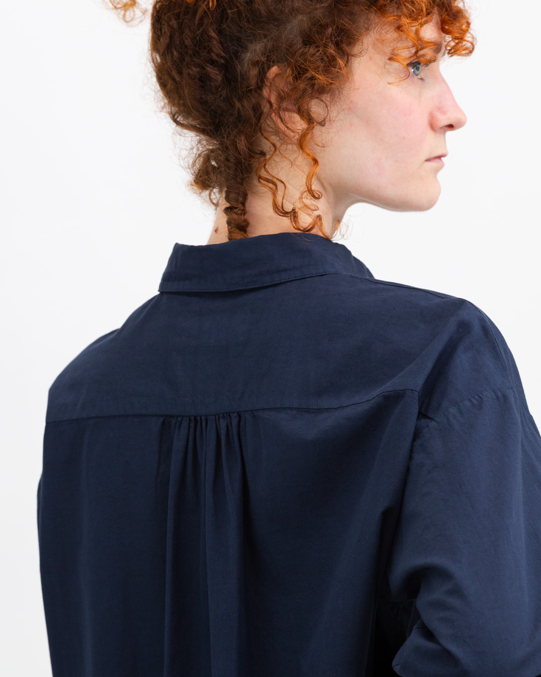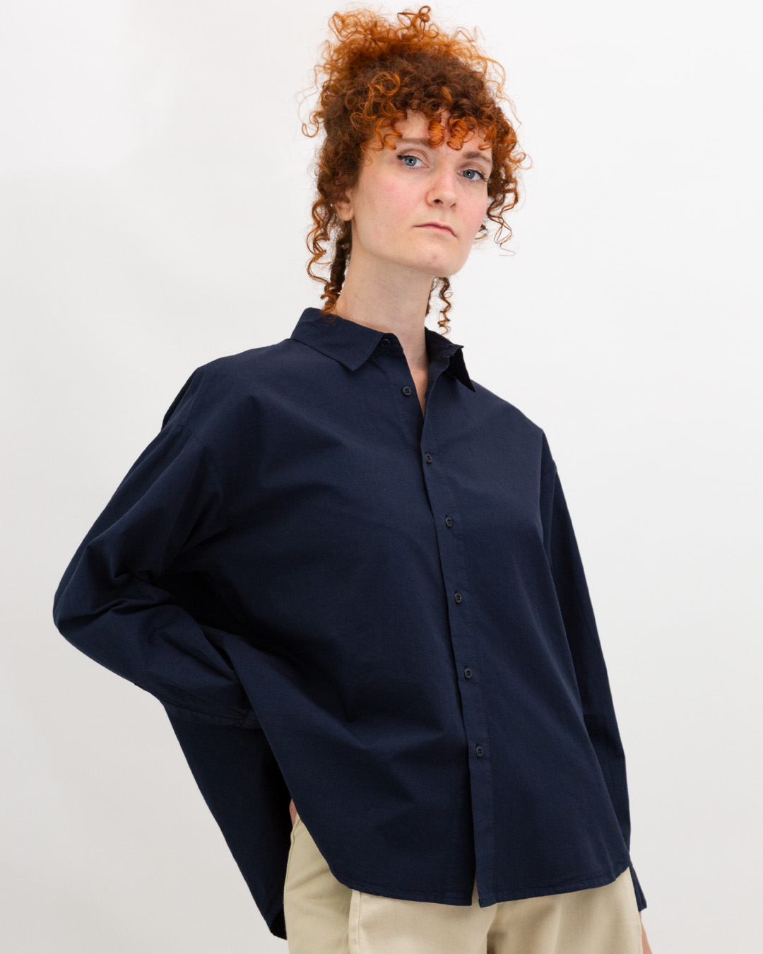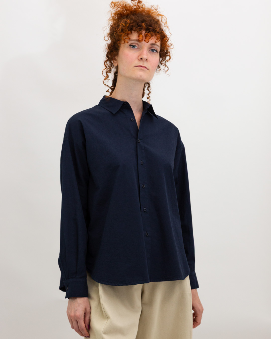 Camicia realizzata in filato di cotone 100%. Collo a revers e maniche lunghe con polsino. Chiusura frontale con bottoni. Camicia tinta in capo artigianalmente. Made in Italy.