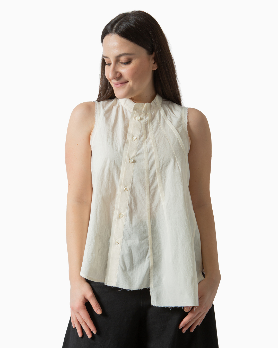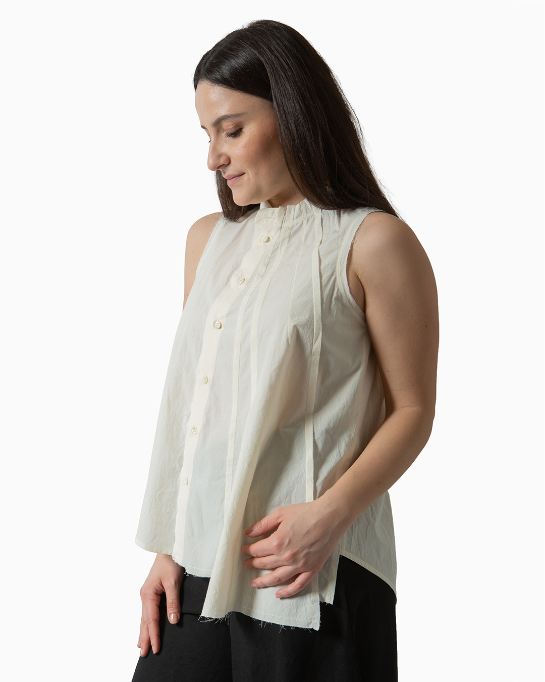 Camicia girocollo in 100% cotone senza maniche. Dettagli di inserti e pieghe. Fit regolare. Made in Italy.