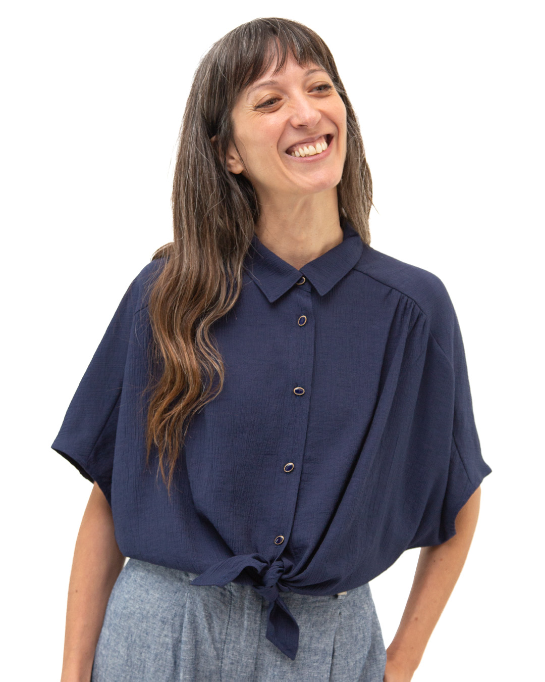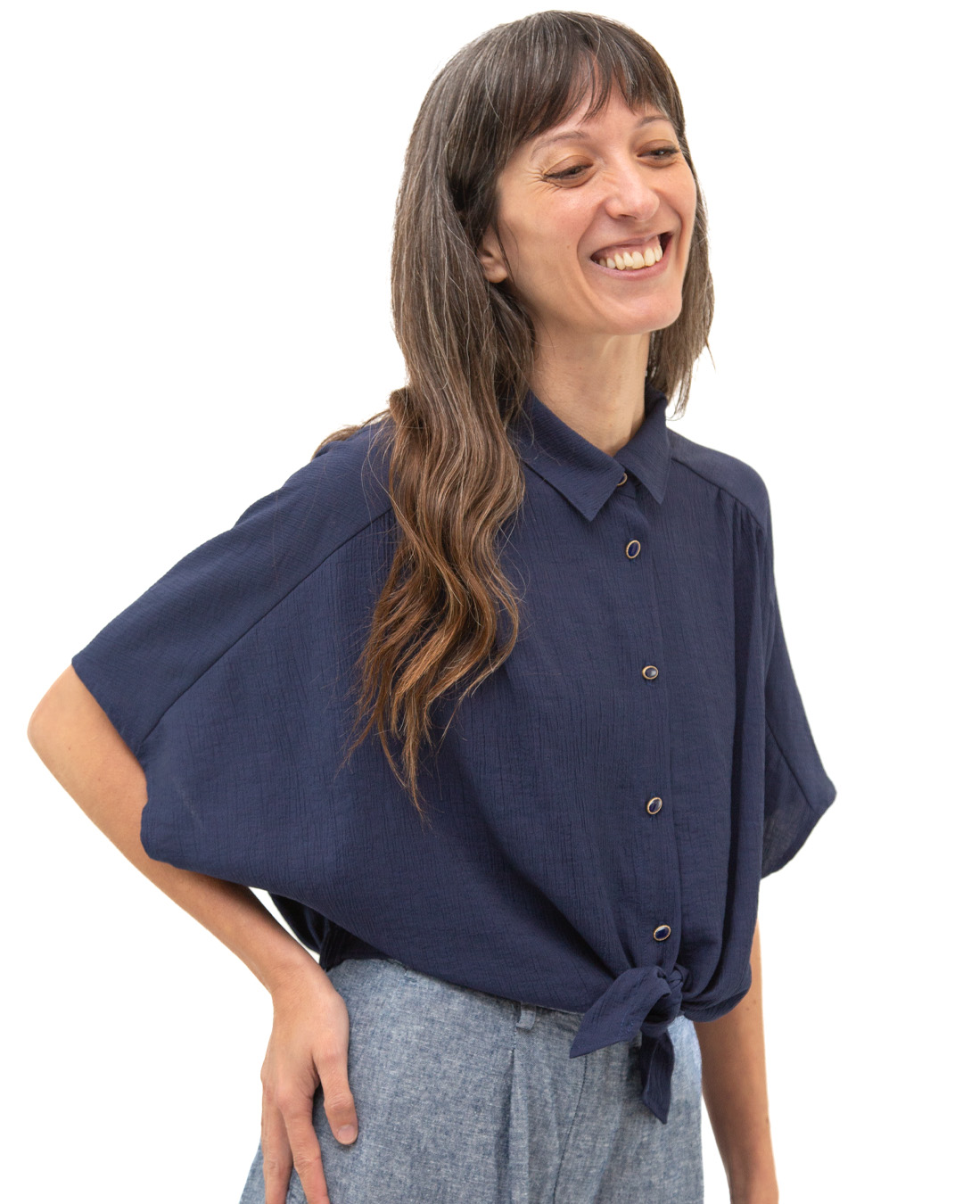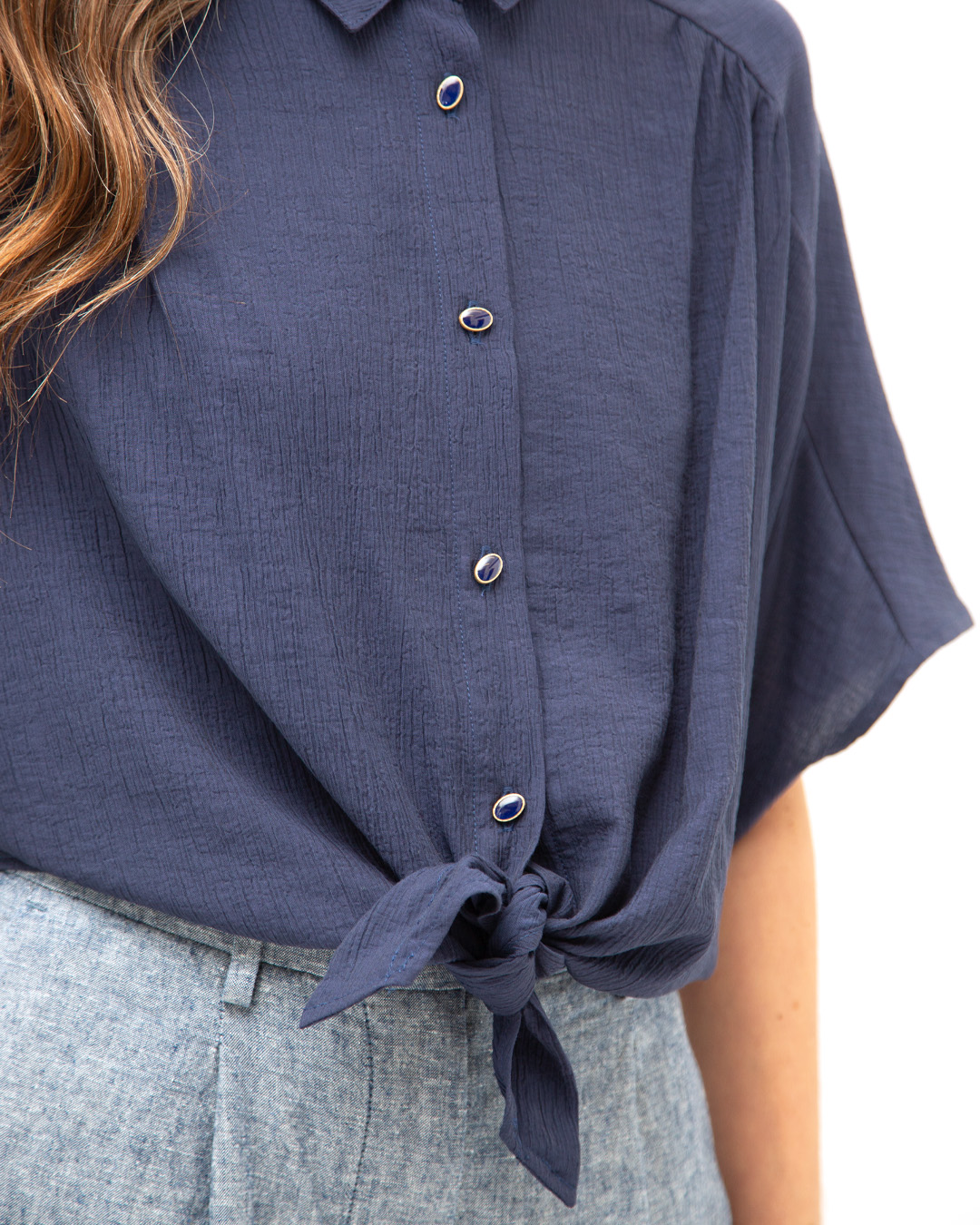 Camicia taglio kimono con colletto. Arricciata in vita con elastico sul dietro. Davanti chiusura con nodo e bottoncini in metallo smaltati. Tessuto: crepe. Colore: blu. Composizione: 83% viscosa 17% poliammide. Designed in France.