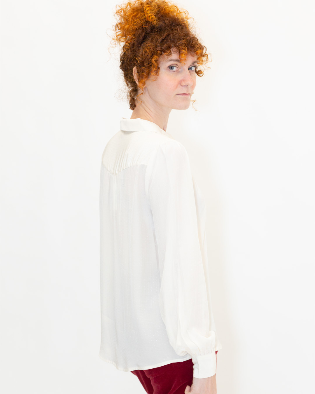 Pieghe sul carrรฉ delle spalle e sulle maniche.