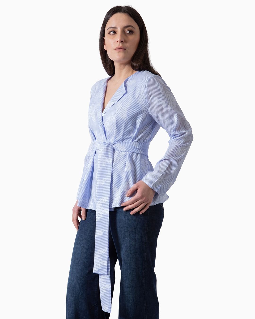 Camicia a fantasia con cintura realizzata in filato di cotone 100%. Taglio ampio e svasato. Chiusura con bottoni fantasia. Made in Italy.
