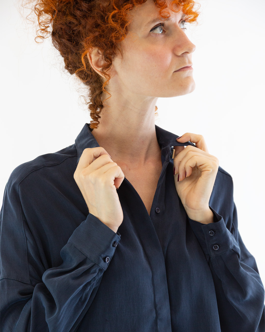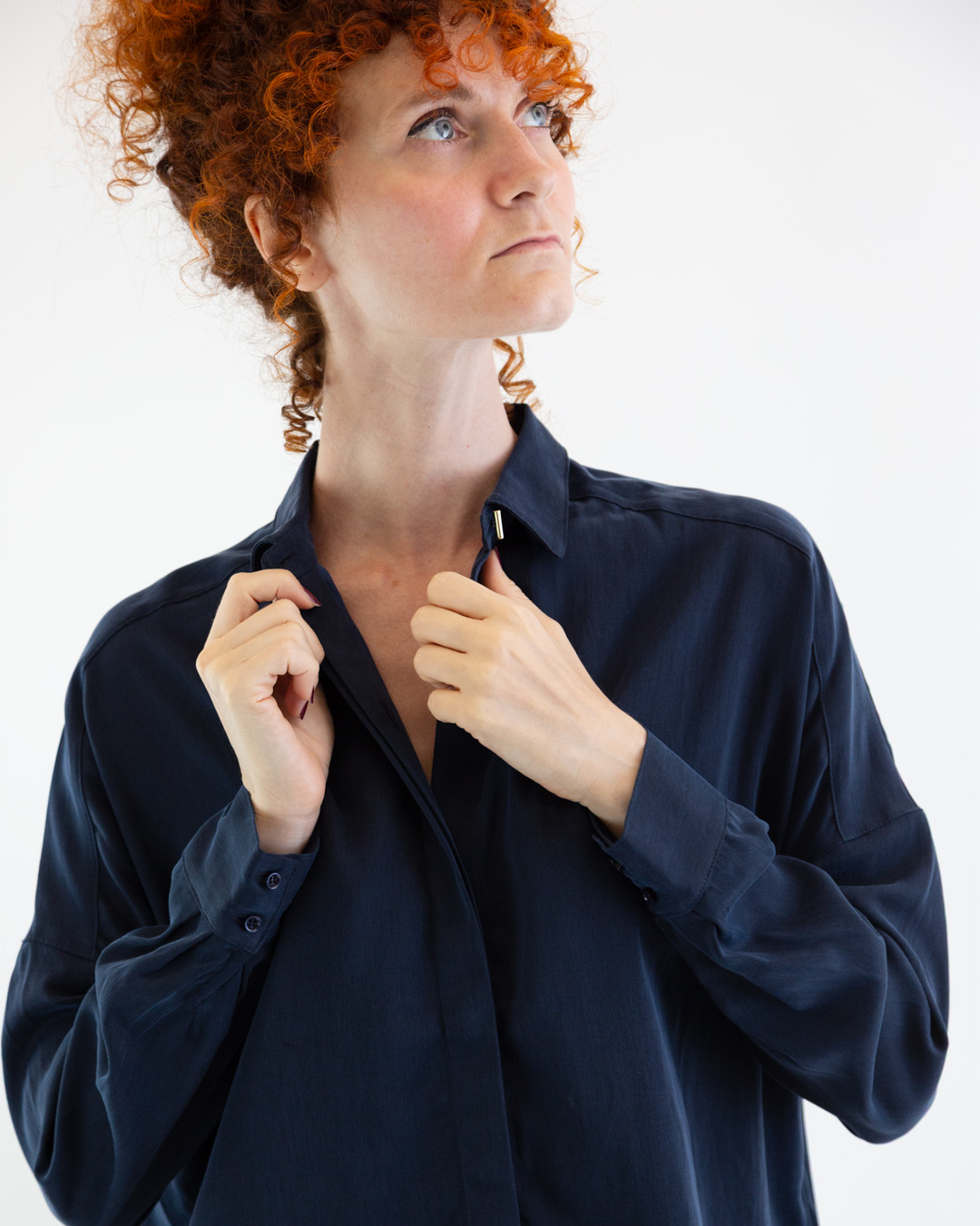 Camicia realizzata in tessuto di raso cupro color navy.