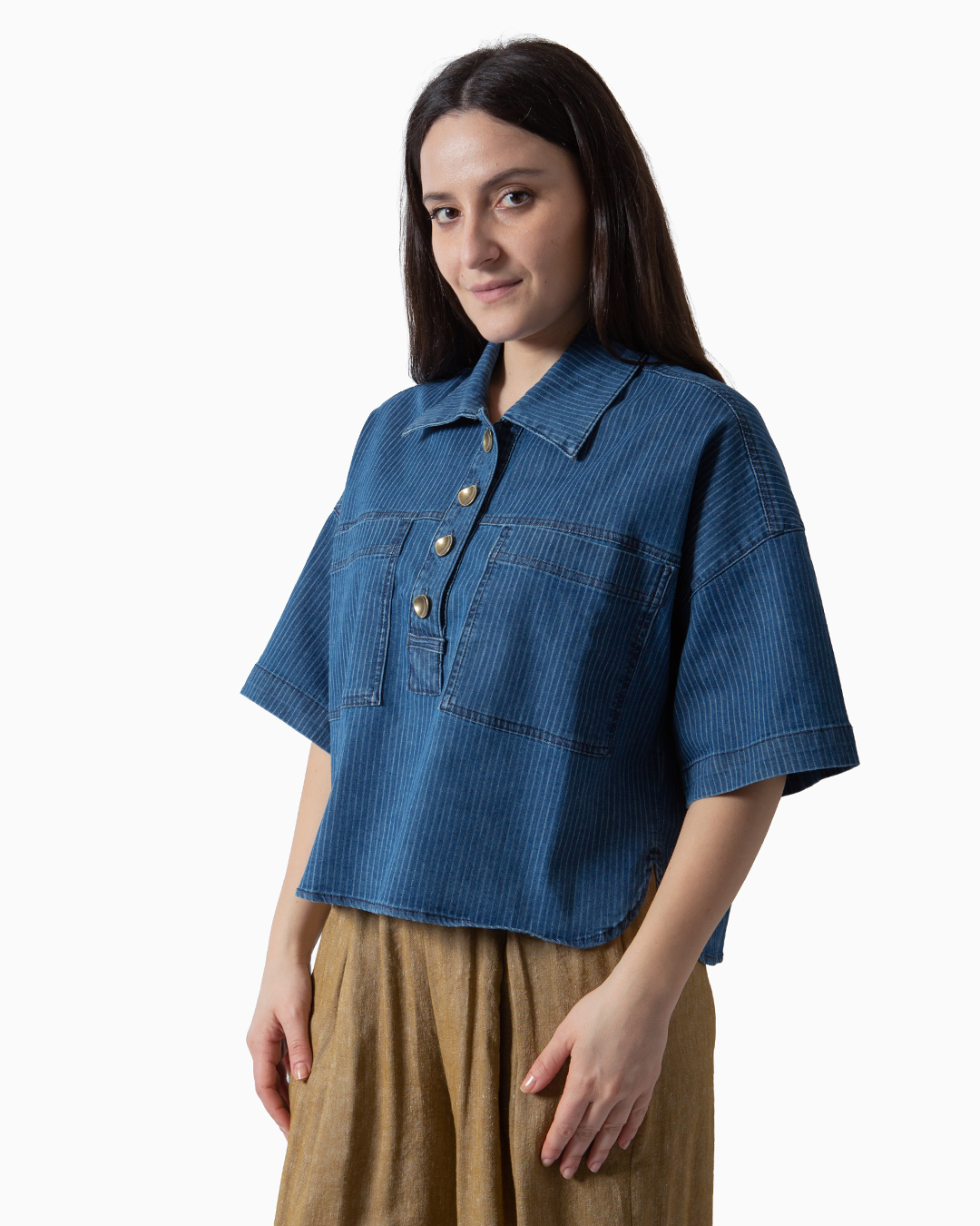 Camicia corta a maniche corte in twill in denim e righe sottili. Patta polo con bottoni gioiello. Tasche applicate con impunture a contrasto. Pieghe piatte sul retro. Composizione: 90% Cotone 8% Poliestere 2% Elastan. Designed in France.