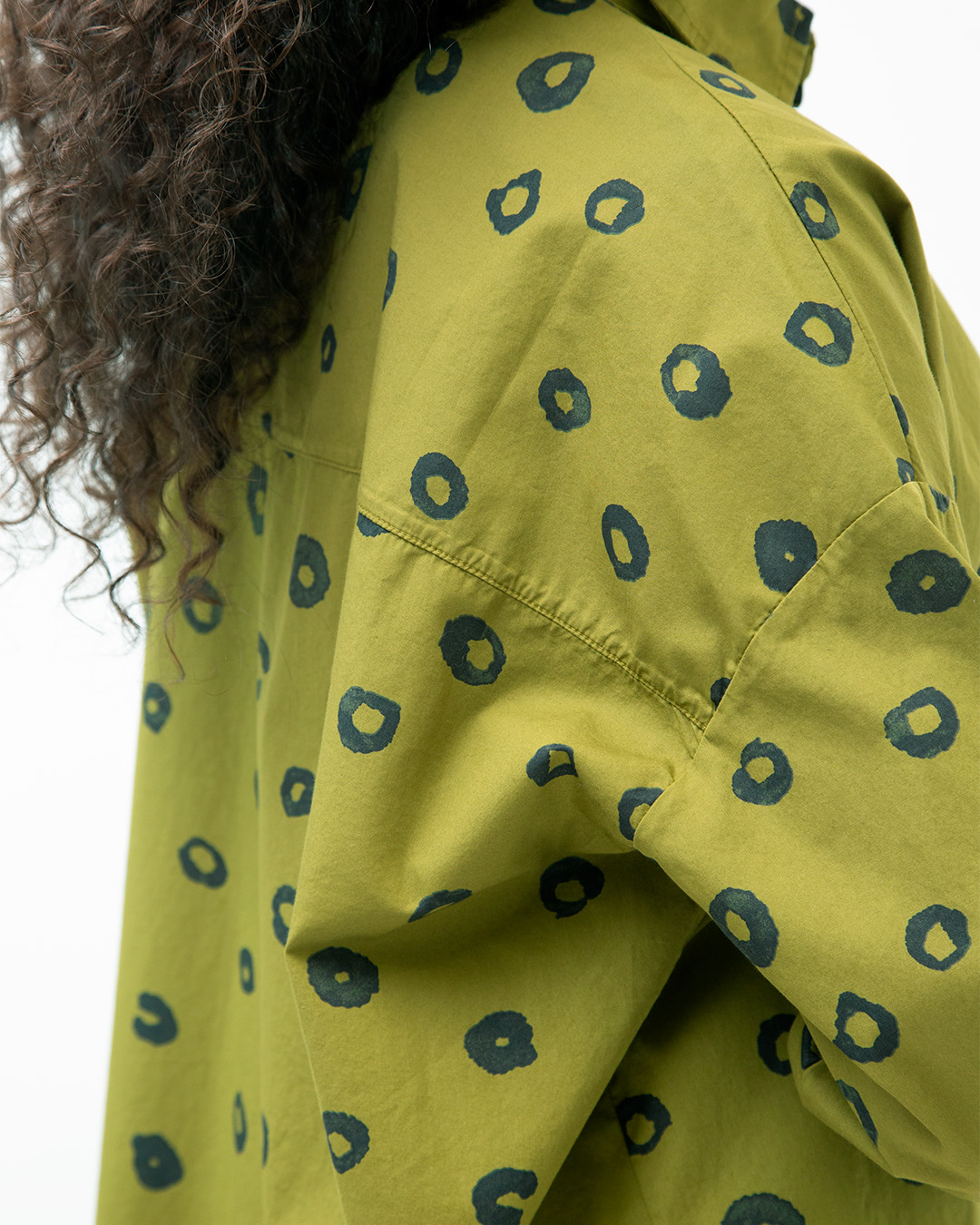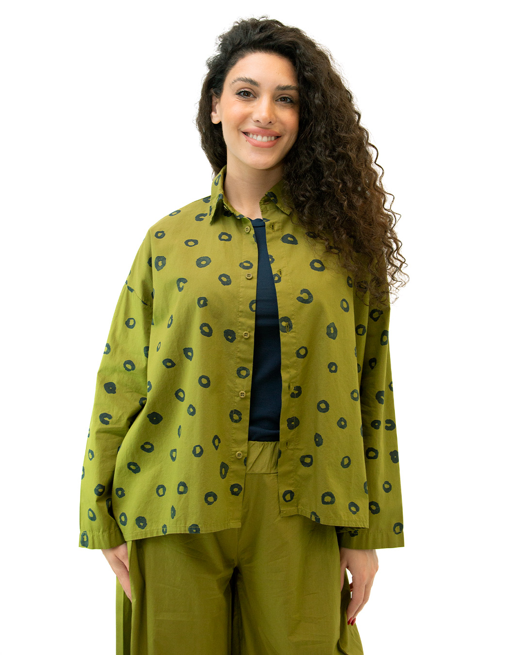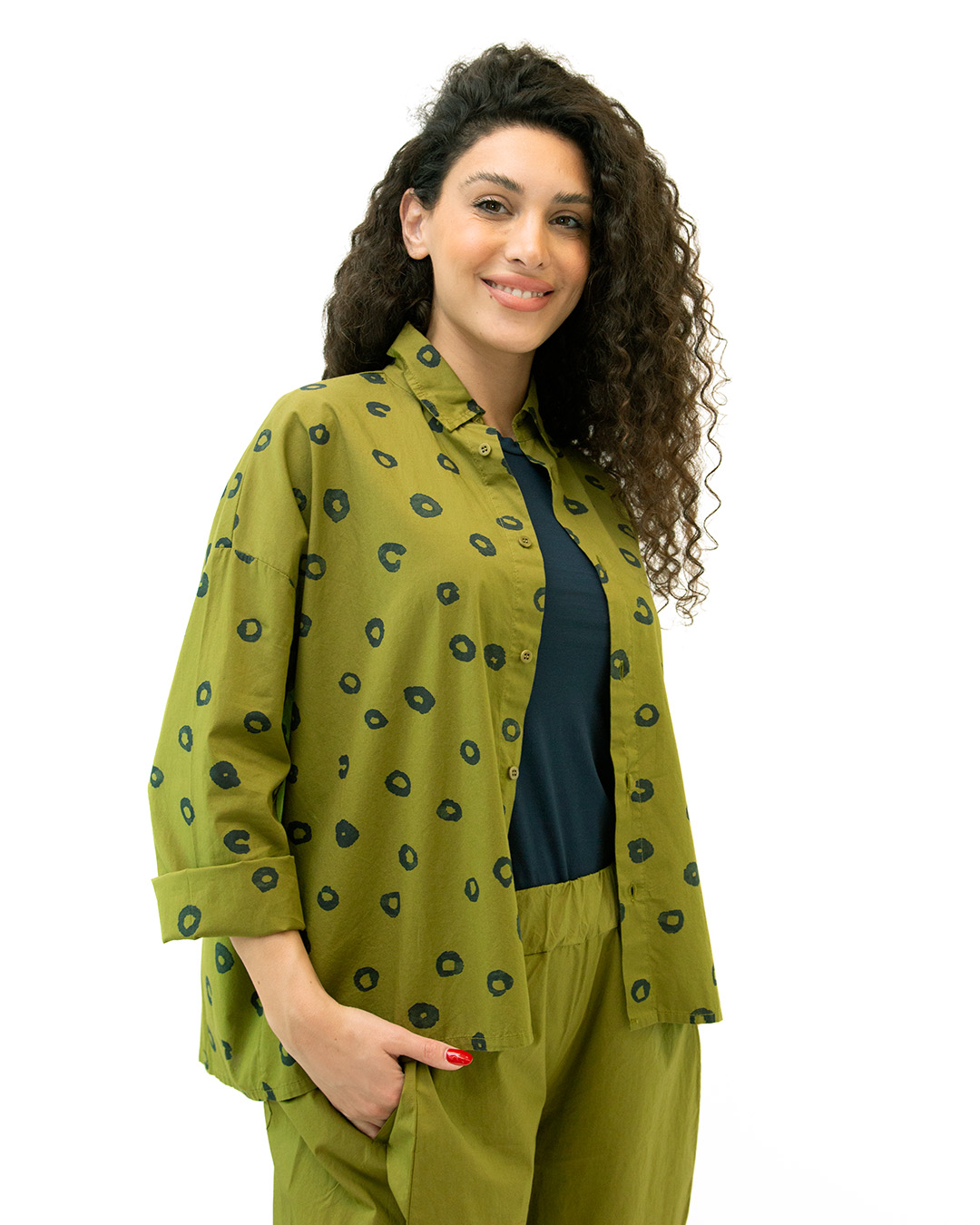 Camicia over. Manica lunga. Tessuto popeline di cotone stampato. Colore: Verdone. Composizione: 100% cotone. Produzione artigianale italiana. Made in Italy.
