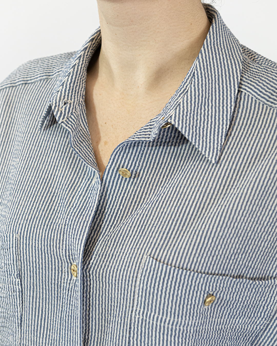 Ampia camicia bianca con finissime righe blu, con bottoncini dorati, manica corta con risvolto, due tasche anteriori con bottoncini, pince sul retro.