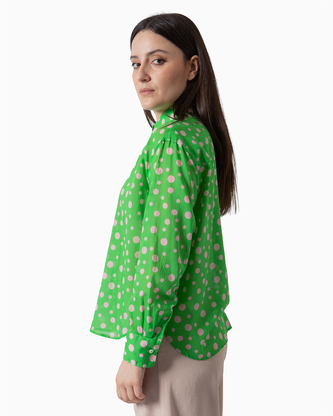 Camicia realizzata in filato di cotone 100%. Collo a revers e maniche lunghe con polsino. Chiusura frontale con bottoni. Made in Italy.