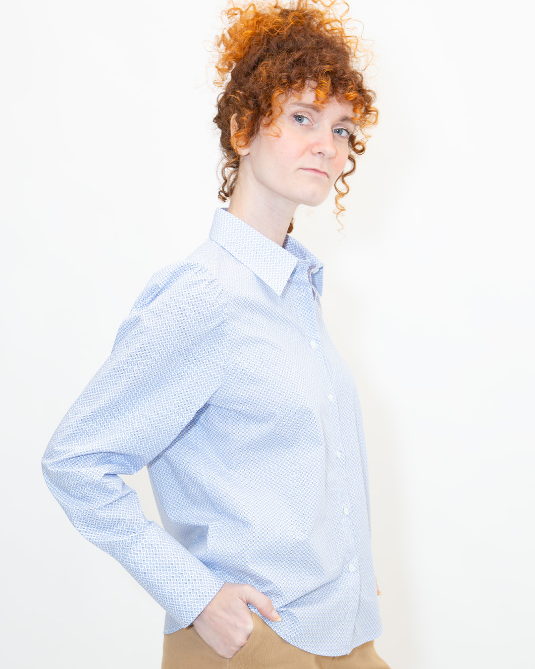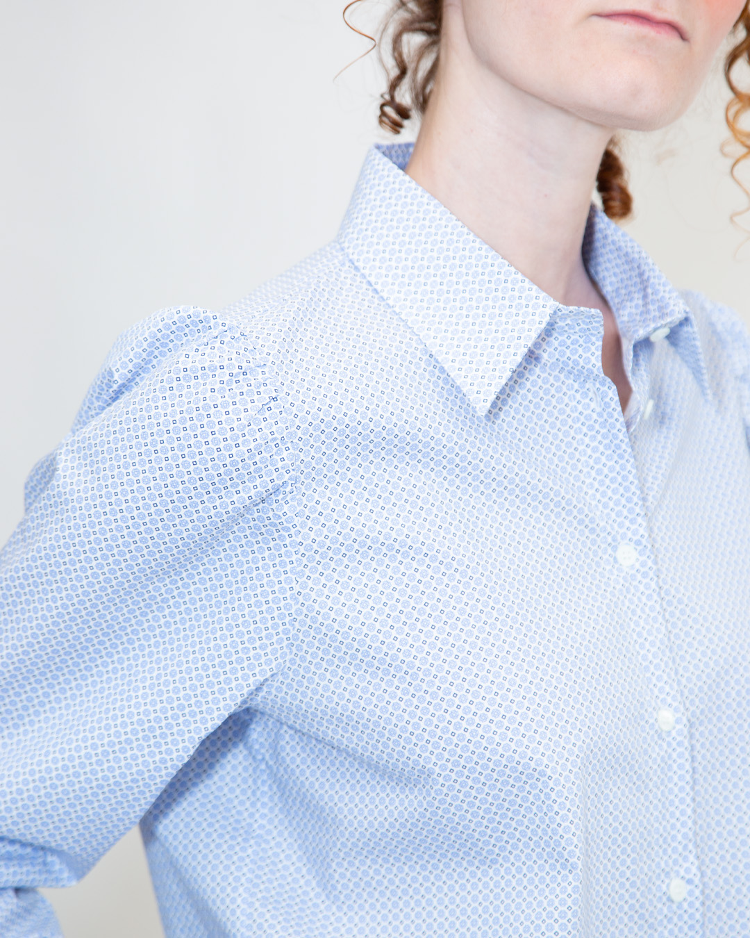 Camicia con collo a revers e dettaglio con una leggera arricciatura sul giromanica.