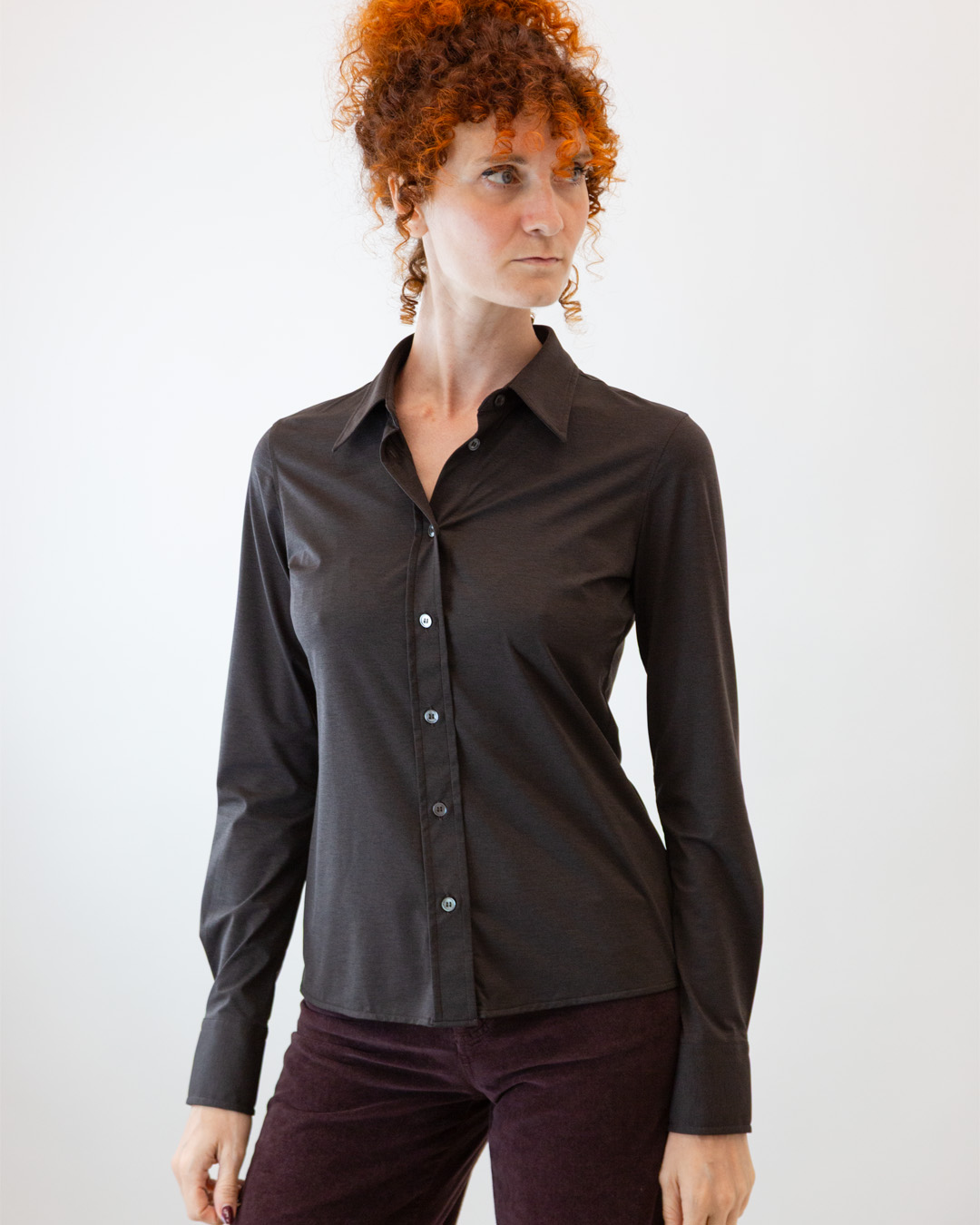 Camicia realizzata con tessuto Skin Like a tinta unita. Vestibilità slim. Maniche lunghe con polsino e finta chiusura frontale con bottoni. Composizione: 85% Poliammide, 15% Elastan. Designed in Italy.
