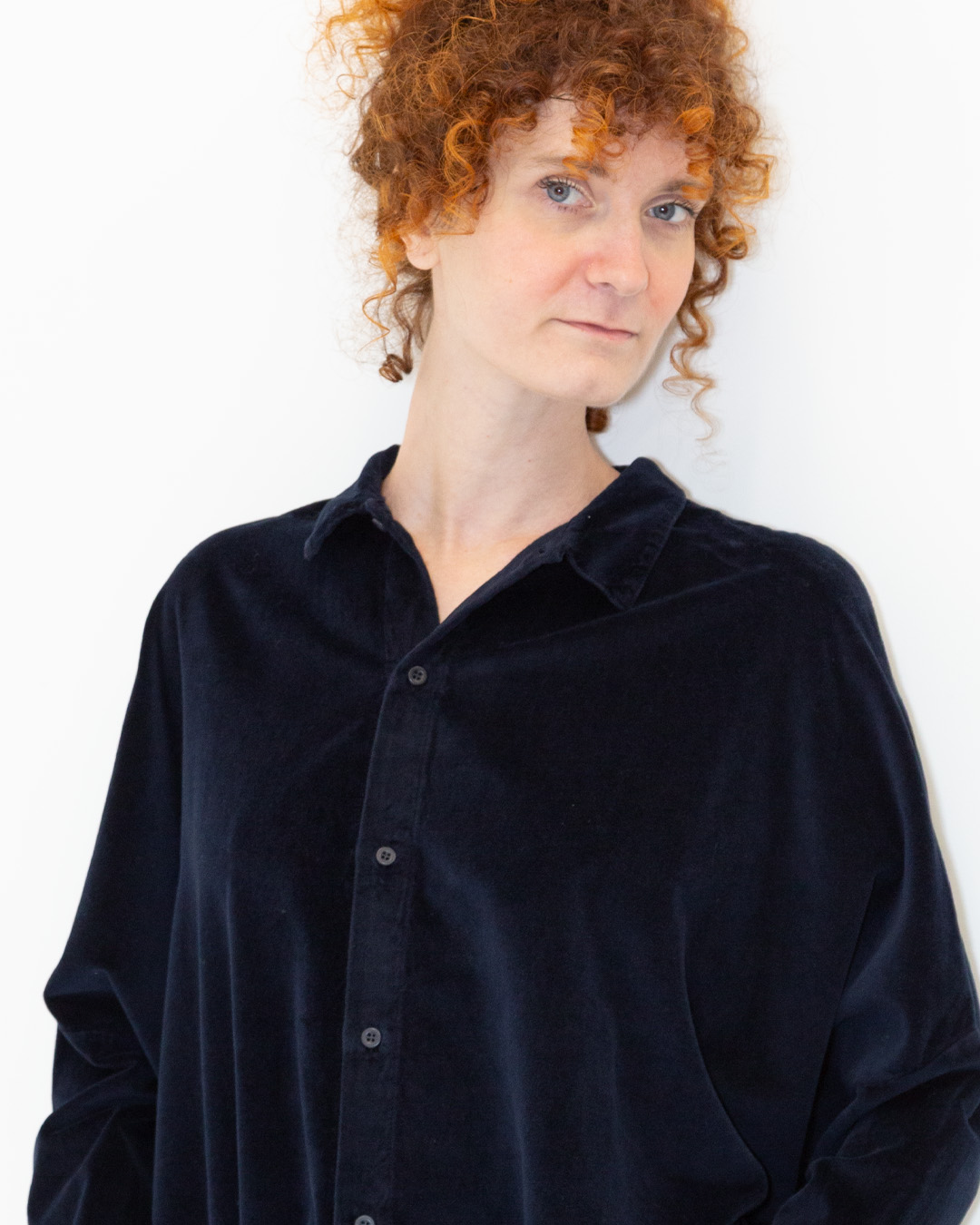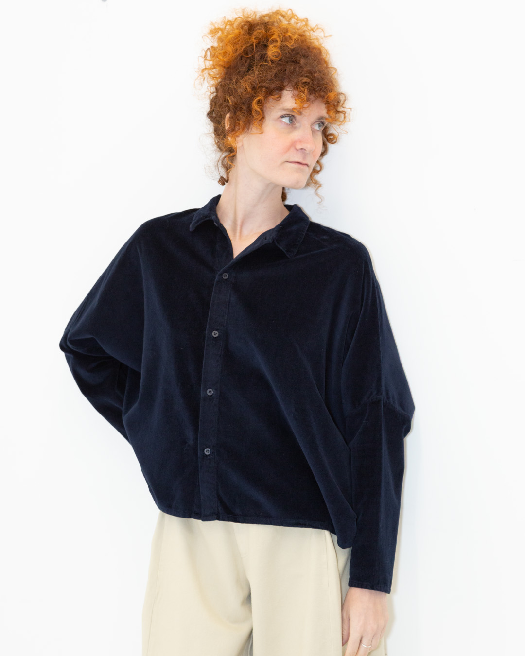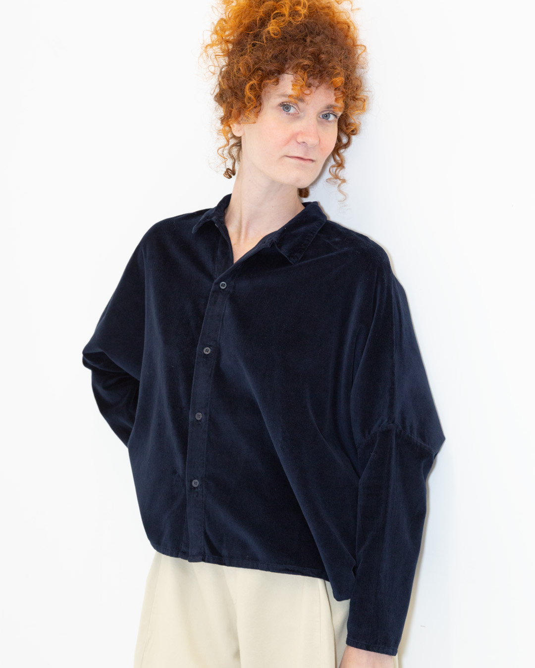 Camicia in velluto realizzata in filato di cotone 100%. Taglio ampio, collo a revers e maniche lunghe. Chiusura frontale con bottoni.