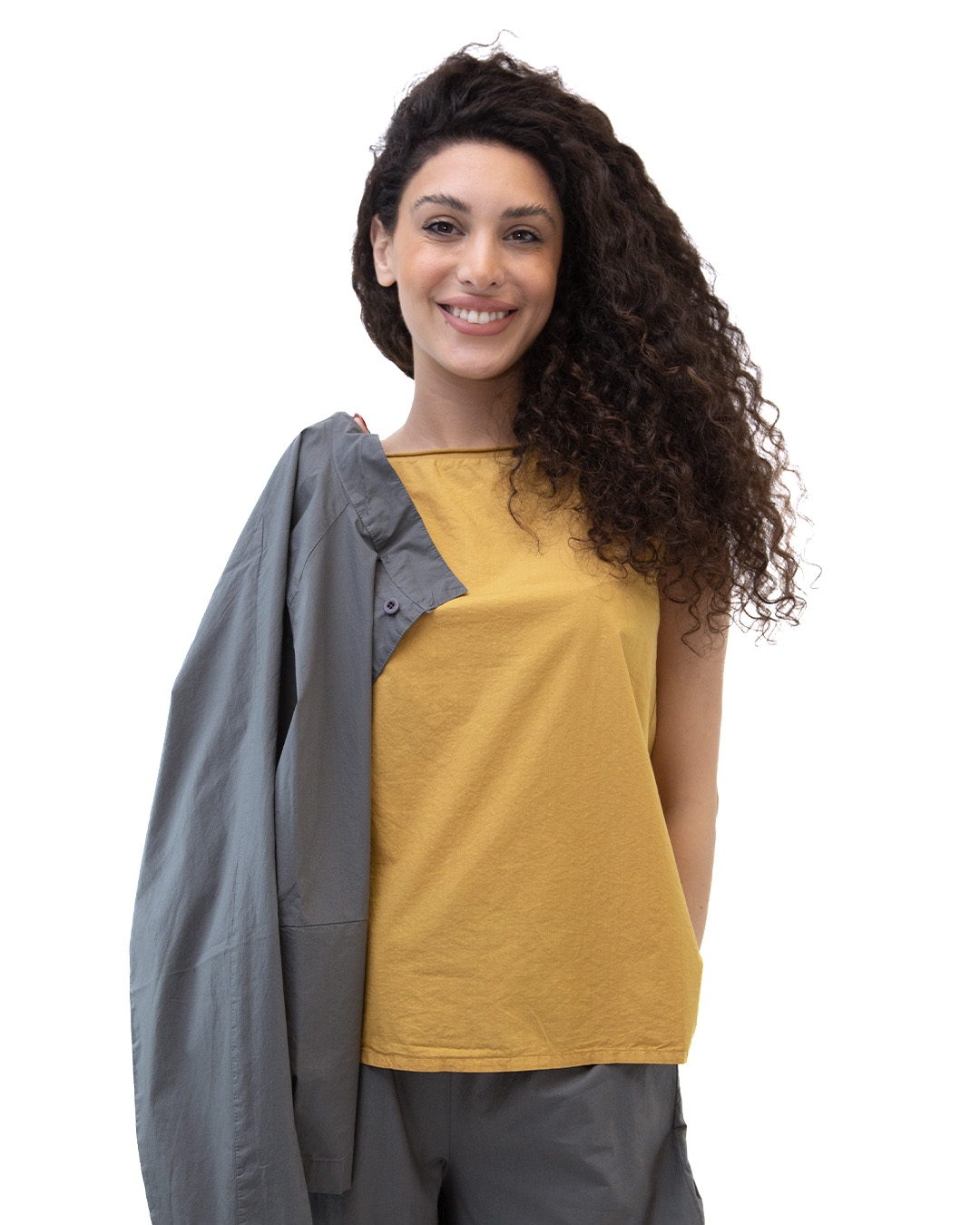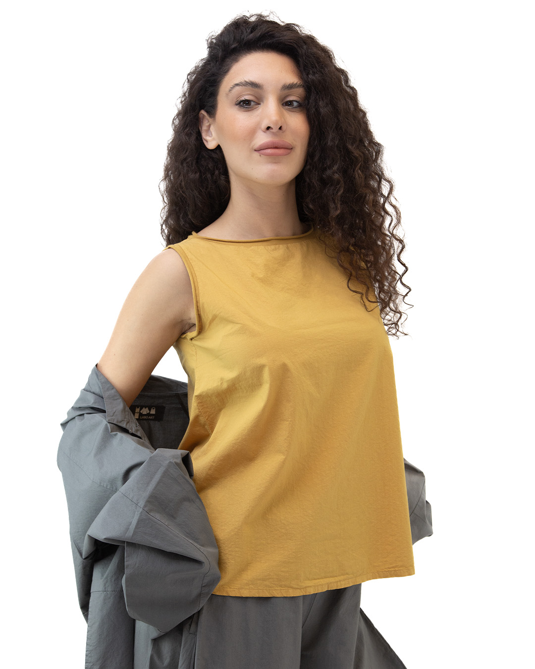 Canotta girocollo. Taglio ad A. Colore: Ambra. Bordino giri collo e giro maniche realizzati in jersey. Tessuto popeline di cotone. Composizione: 100% cotone. Produzione artigianale italiana. Made in Italy.
