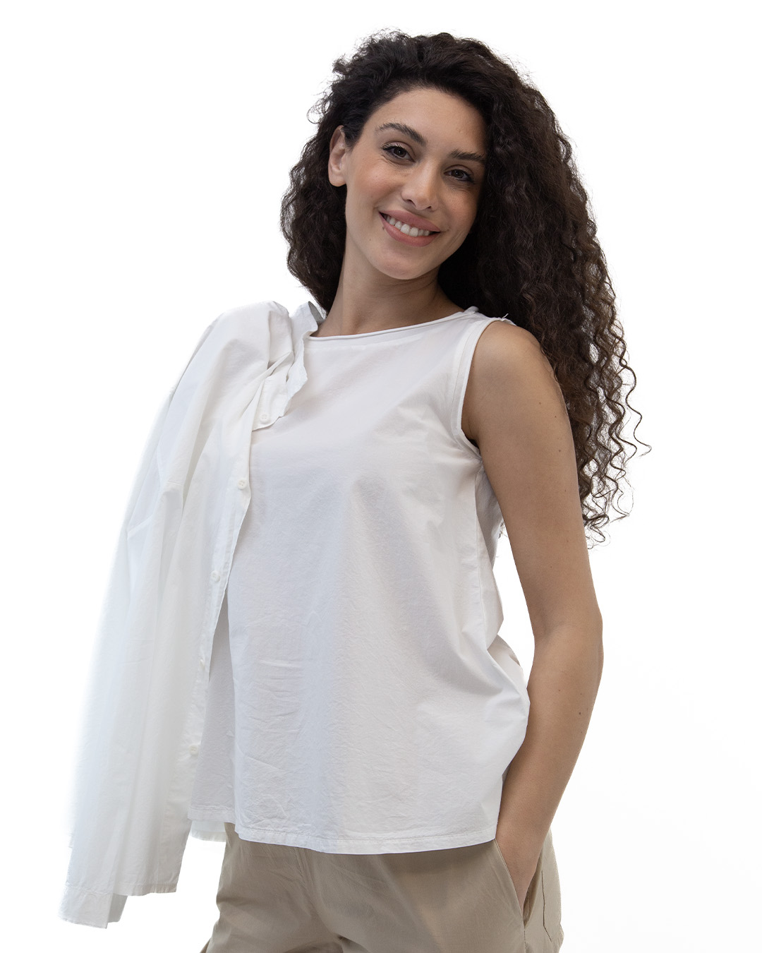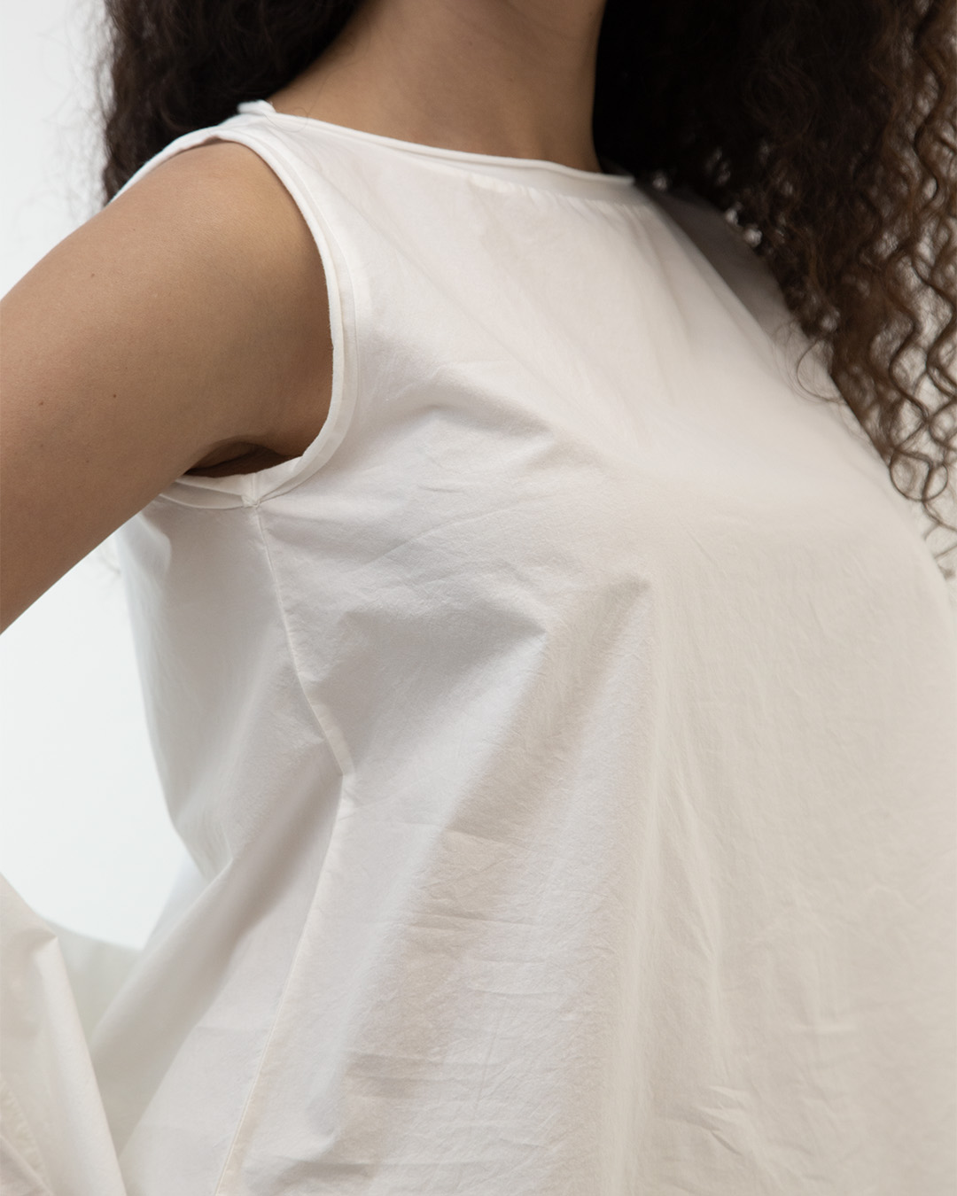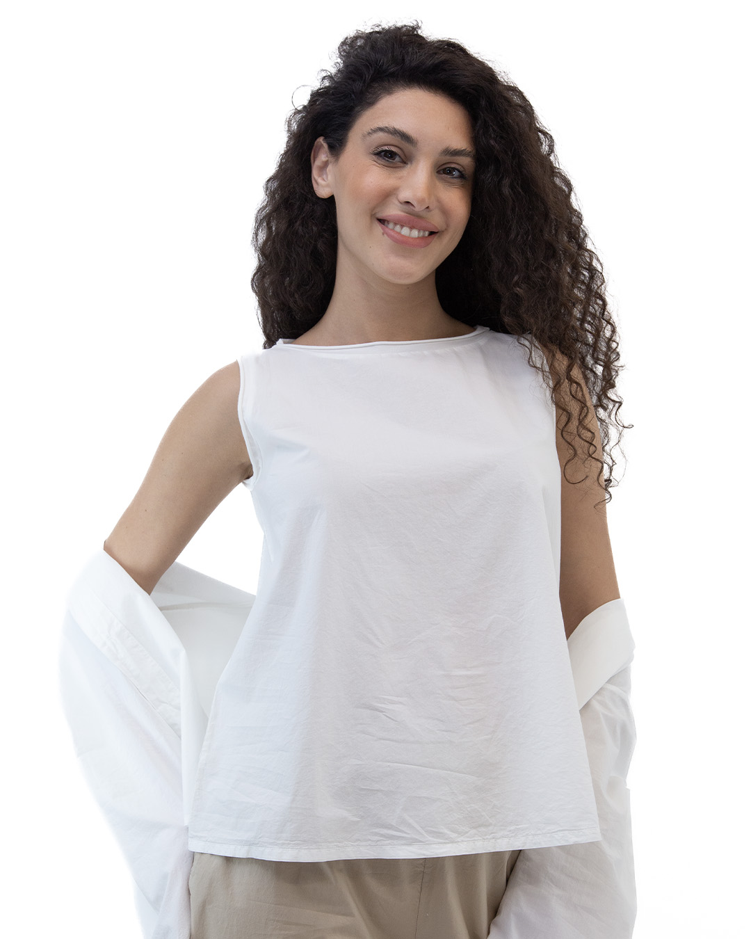 Canotta girocollo. Taglio ad A. Colore: bianco. Bordino giri collo e giro maniche realizzati in jersey. Tessuto popeline di cotone. Composizione: 100% cotone. Produzione artigianale italiana. Made in Italy.