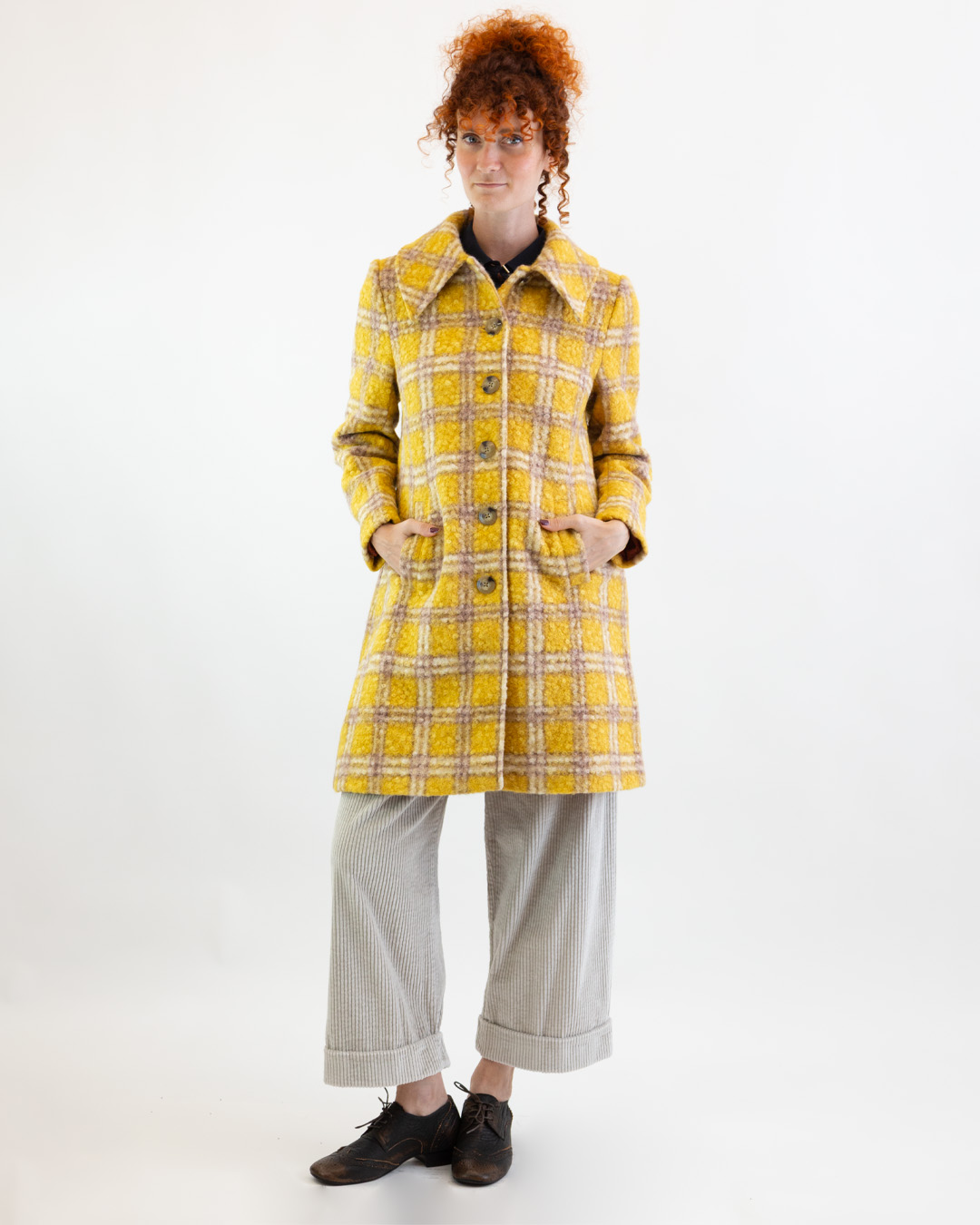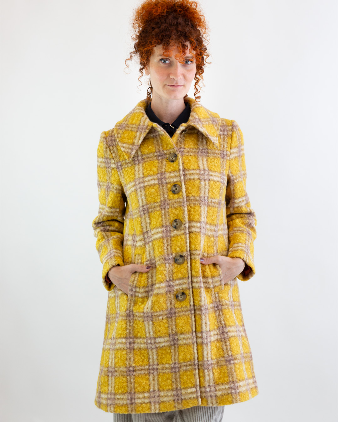 Cappotto realizzato in tessuto bouclè con fantasia a quadri sui toni del giallo.