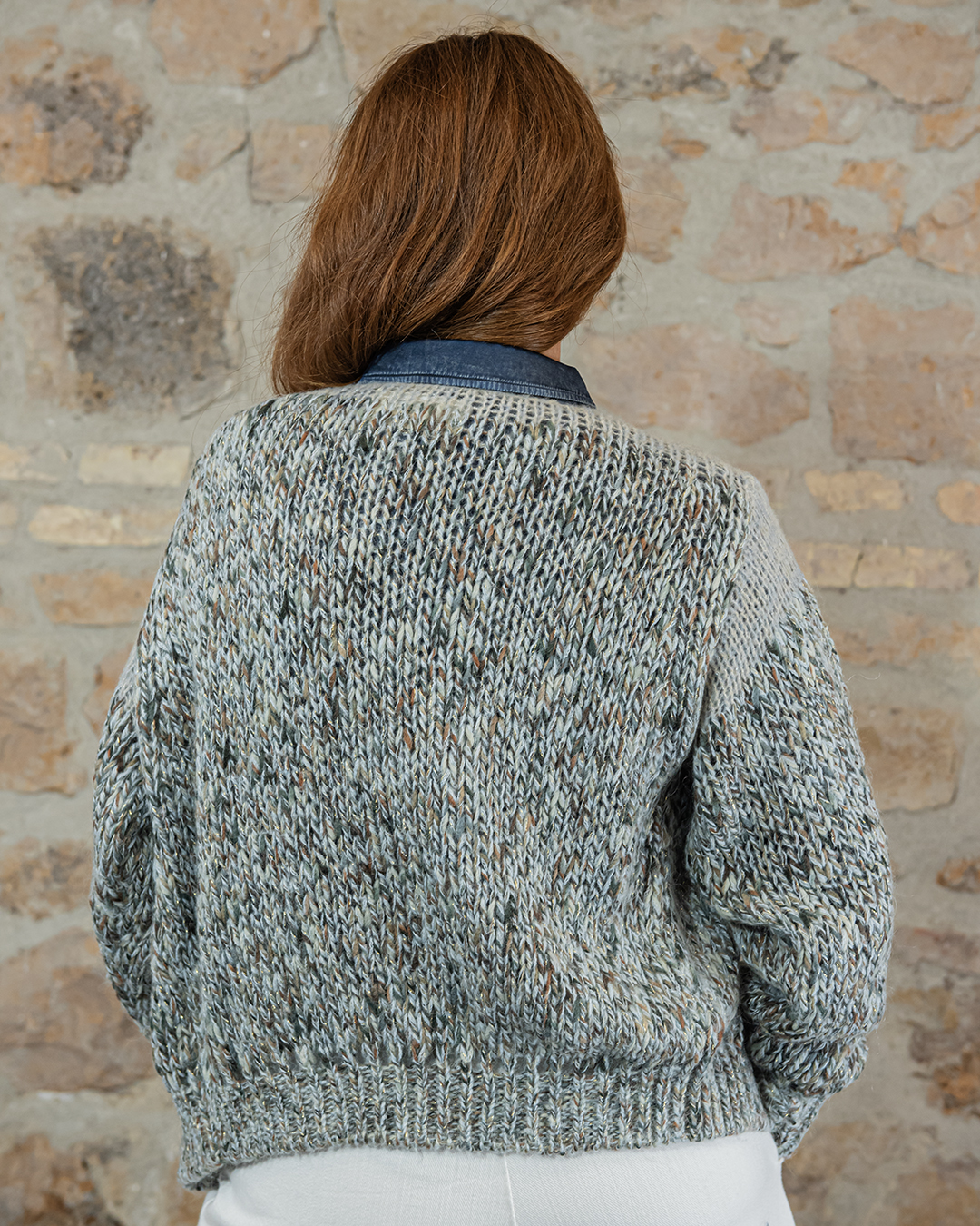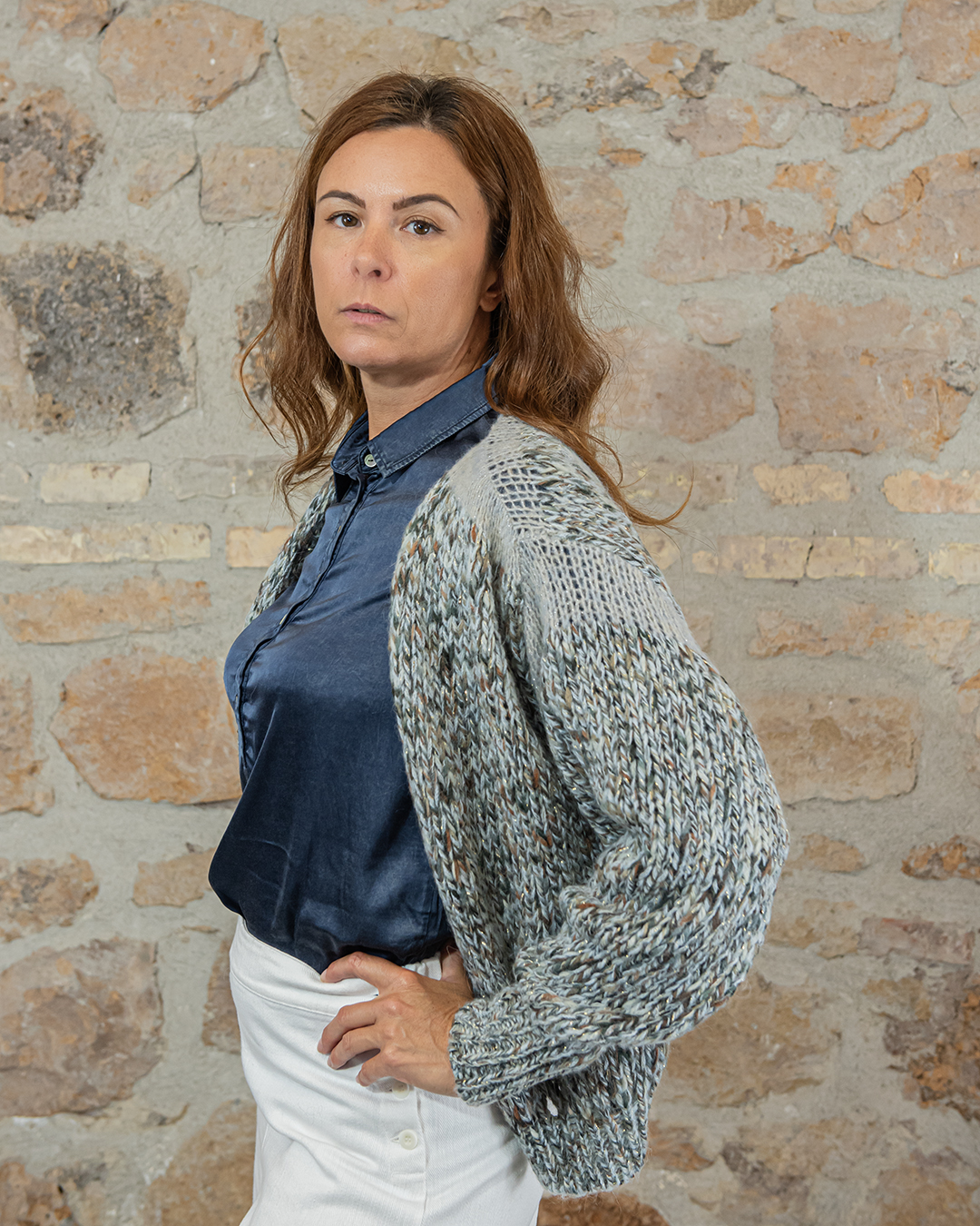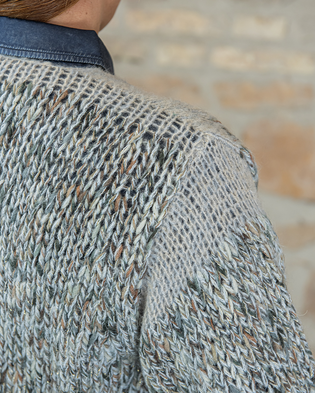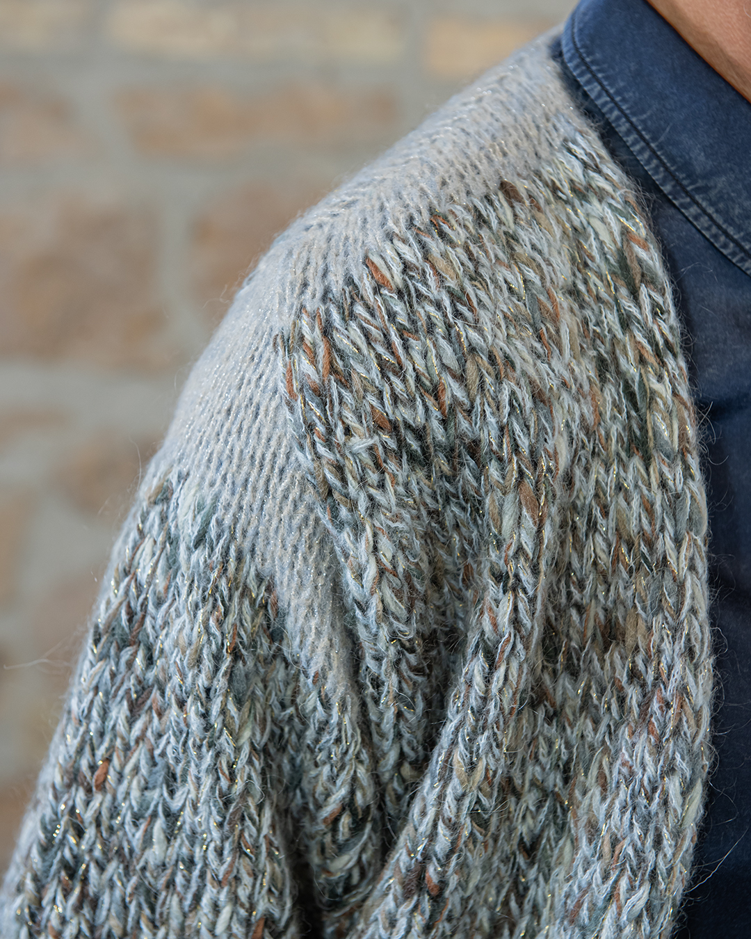Delicata lavorazione sulla spalla e sulla manica in mohair.