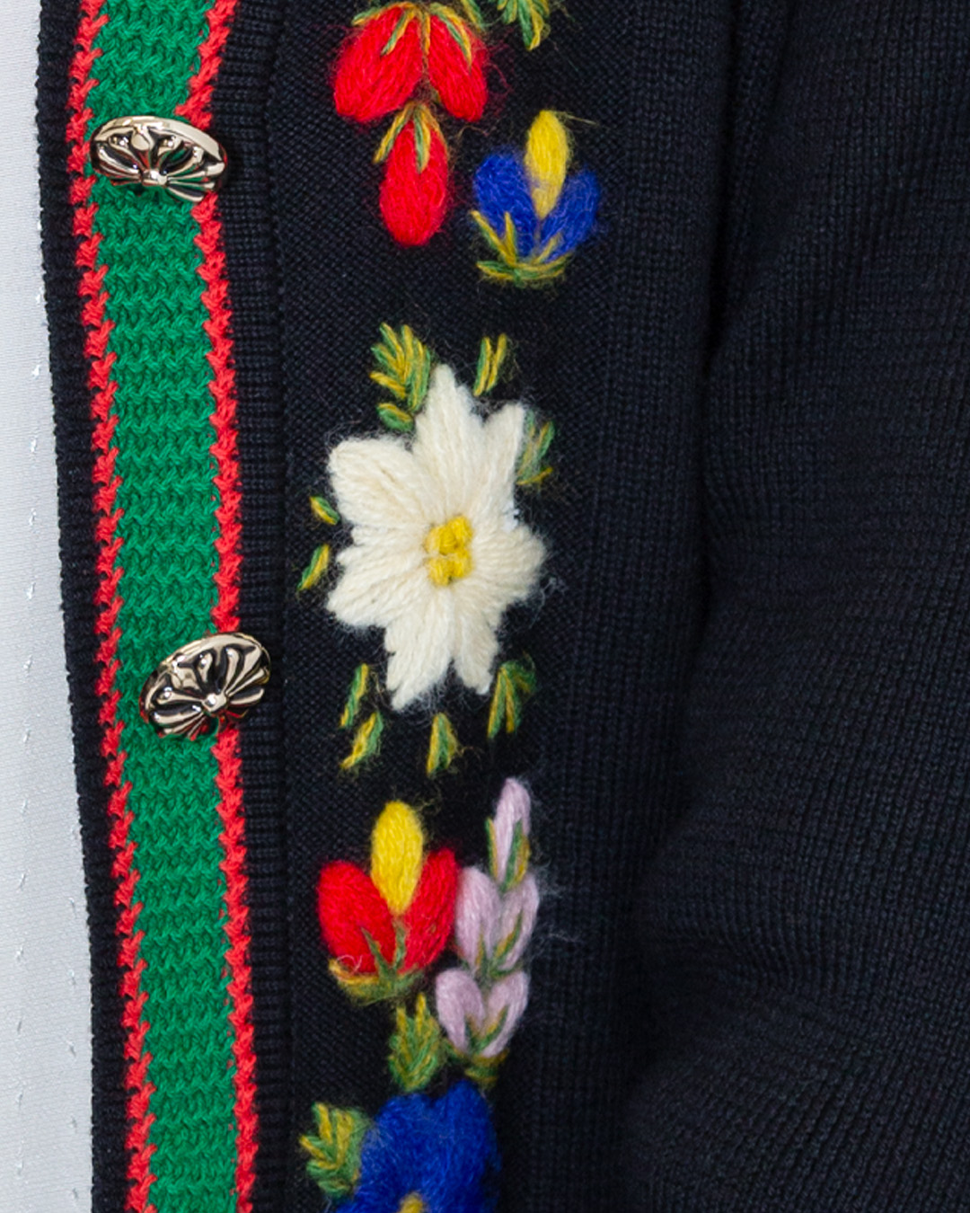 Cardigan realizzato in maglia di cotone elasticizzato con vivaci ricami floreali.