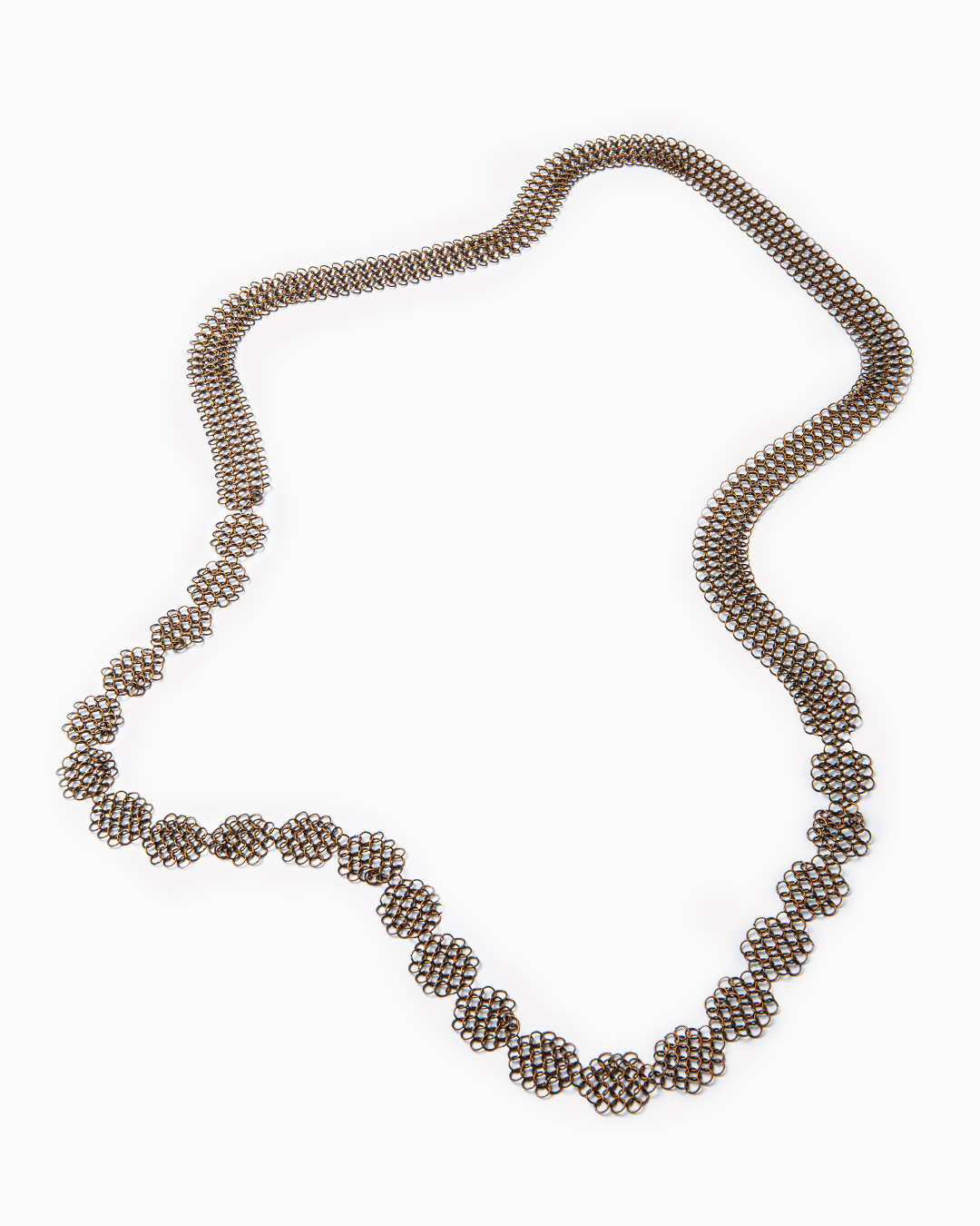 La collana si ispira a un motivo geometrico che ricorda un fiore. E’ realizzata in cotta di maglia fine color bronzo. Può essere indossata in diversi modi, da sola o in coppia. Materiale: acciaio. Dimensioni: 100 x 1,6 cm. Made in France.