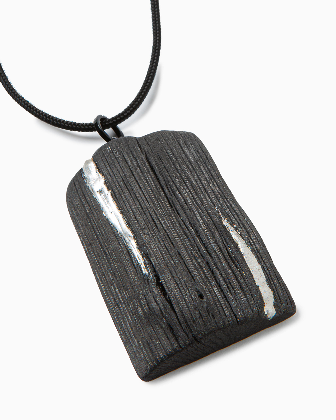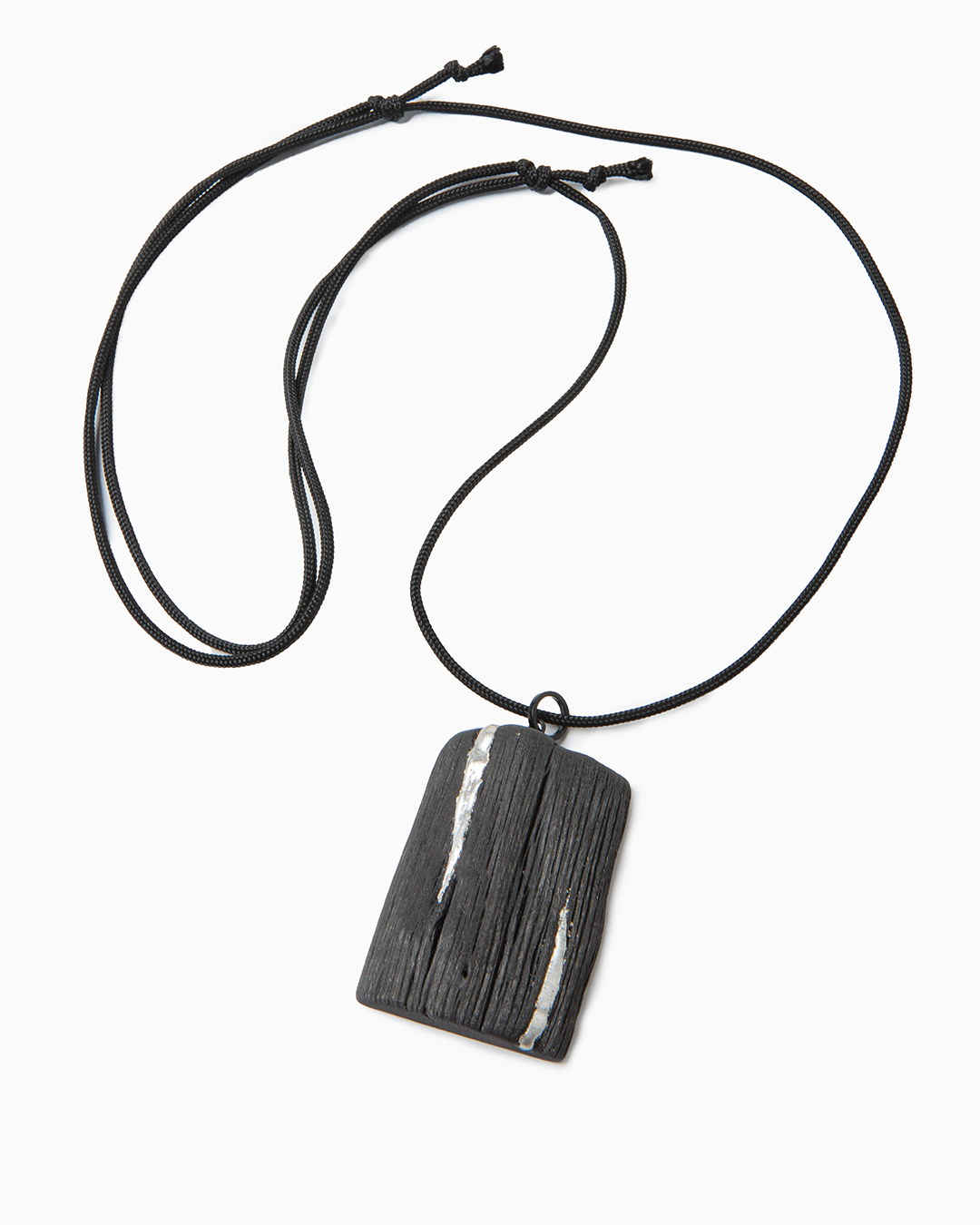 Collana realizzata con carbone giapponese attraverso un processo di combustione che lo trasforma in un minerale duro e stabile.