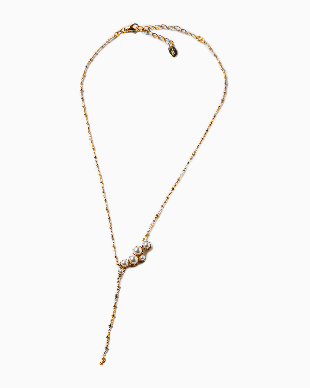 Collana costituita da un elemento creato da un’alternanza di perle di vetro grandi e piccole, impreziosita da una parte finale in catena.