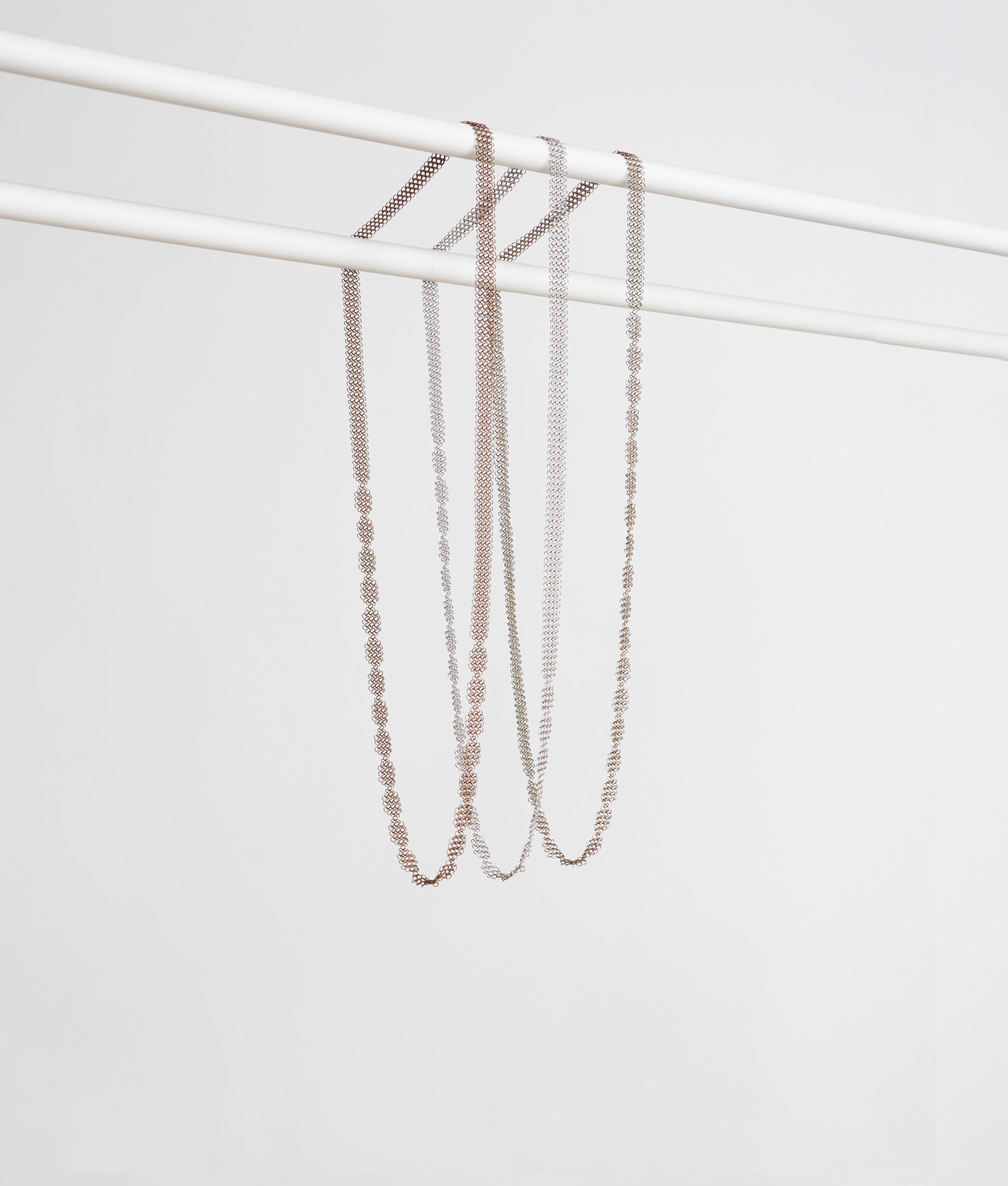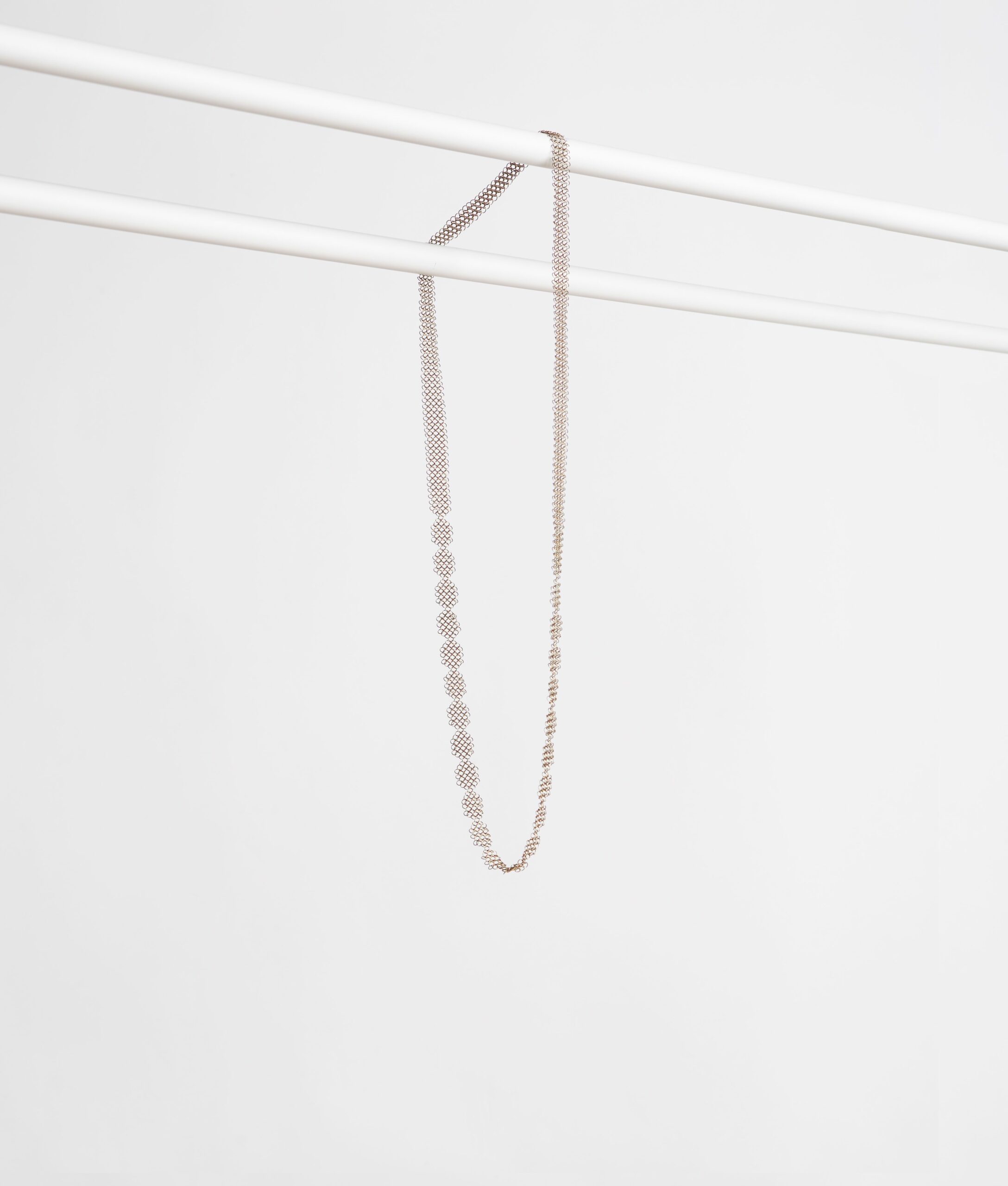 La Rosmary ha un motivo geometrico e floreale, particolarmente leggero in cotta di maglia, diametro 3,5 mm. Dimensioni: cm 100 x 1,6. Materiali: acciaio inossidabile. Colore light. Made in France.