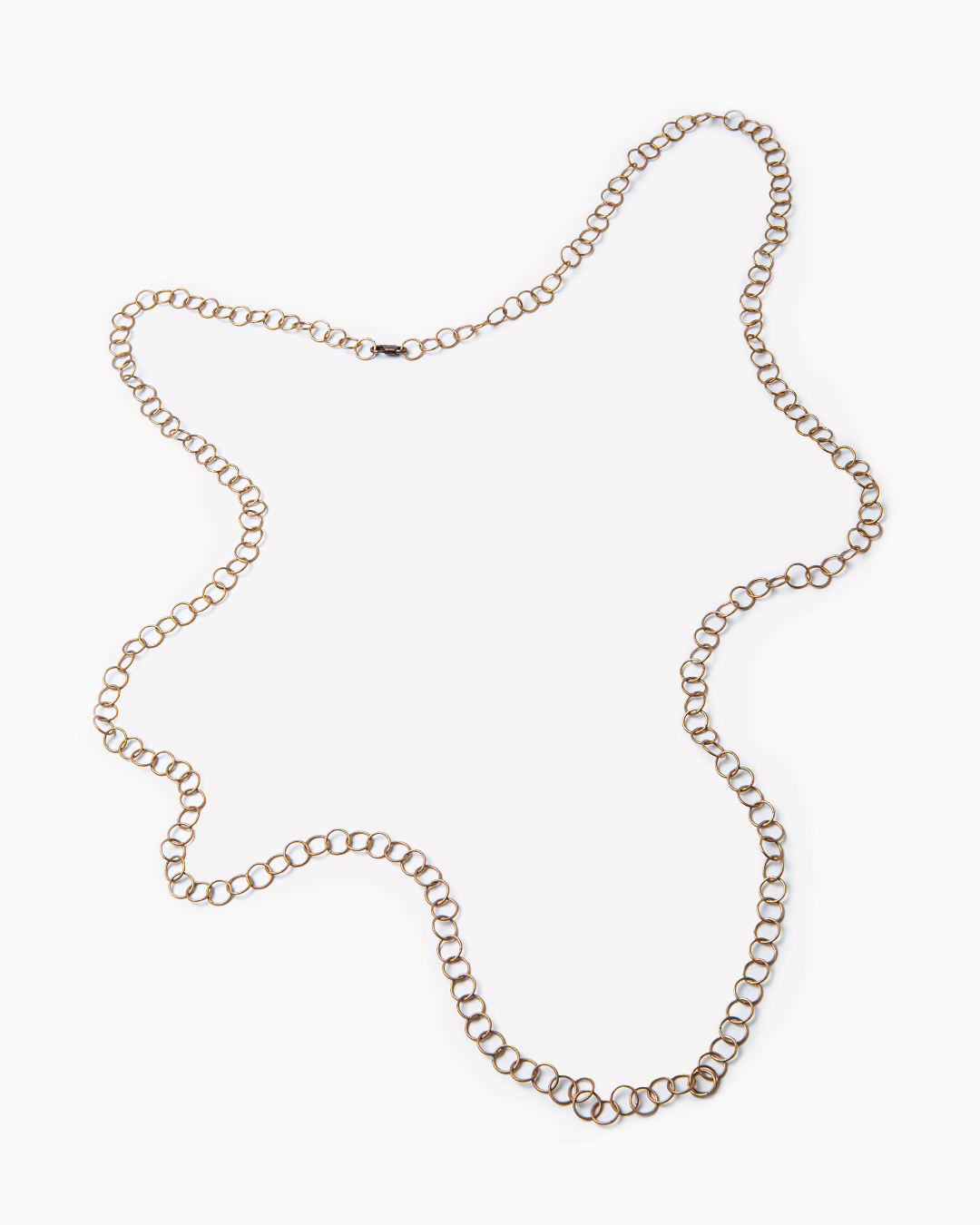 Collana realizzata in cotta di maglia in bagno oro opaco. Composta da un sola fila di anelli. Puรฒ essere indossata da sola o in coppia. Materiale: Bronzo grezzo sabbiato. Dimensioni: 108 x 0,7 cm. Made in France.