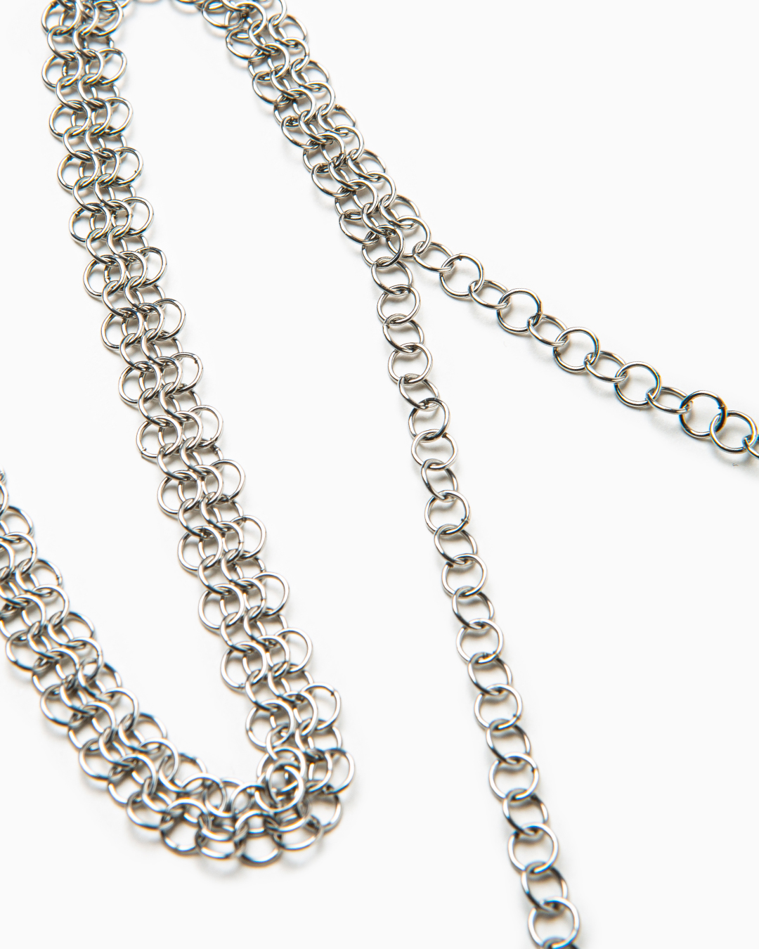 Collana lunga realizzata in cotta di maglia fine. Un lungo nastro di maglia fine si divide per creare una collana a forma di “Y”. Materiale: acciaio inossidabile lucidato. Dimensioni: 72+ cm. Made in France.