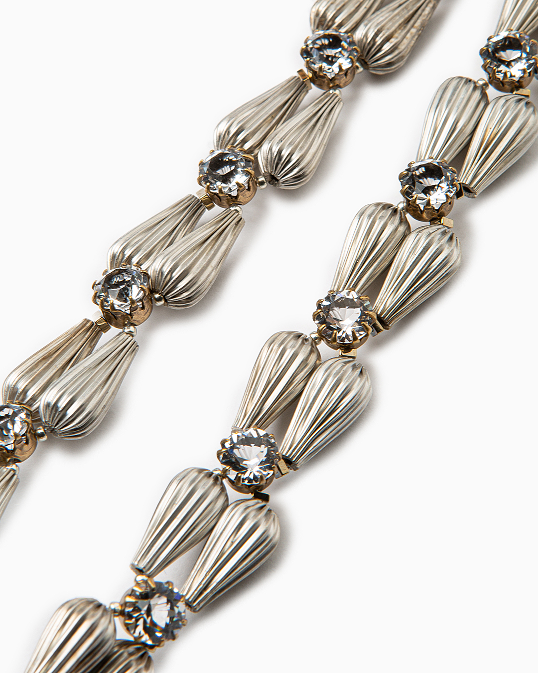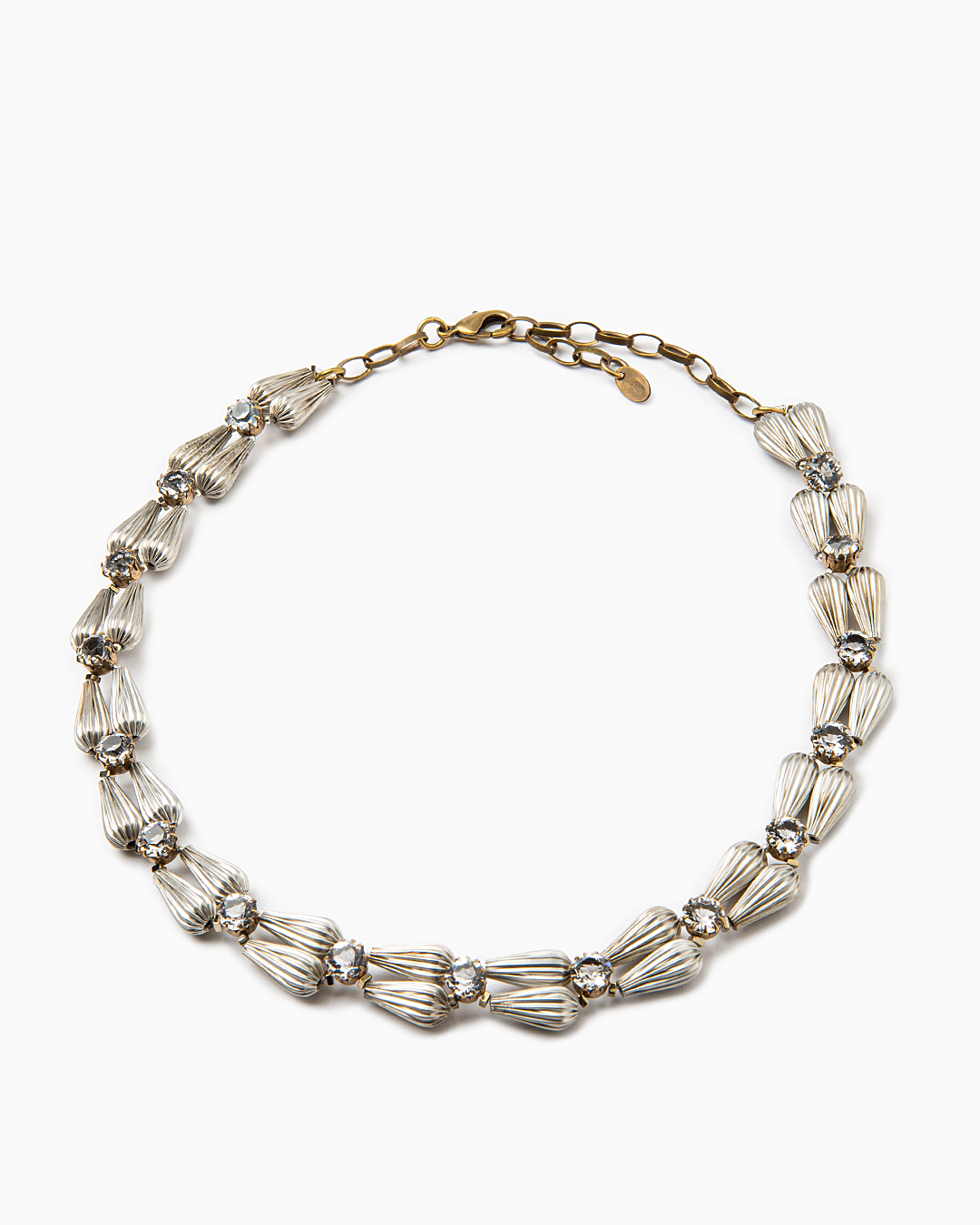 Collier caratterizzato da una simmetria di gocce metalliche insieme a piccoli tondi di cristallo. Impreziosito da schegge di ematite. Tutti i materiali sono anallergici e nickel free. Produzione artigianale italiana.