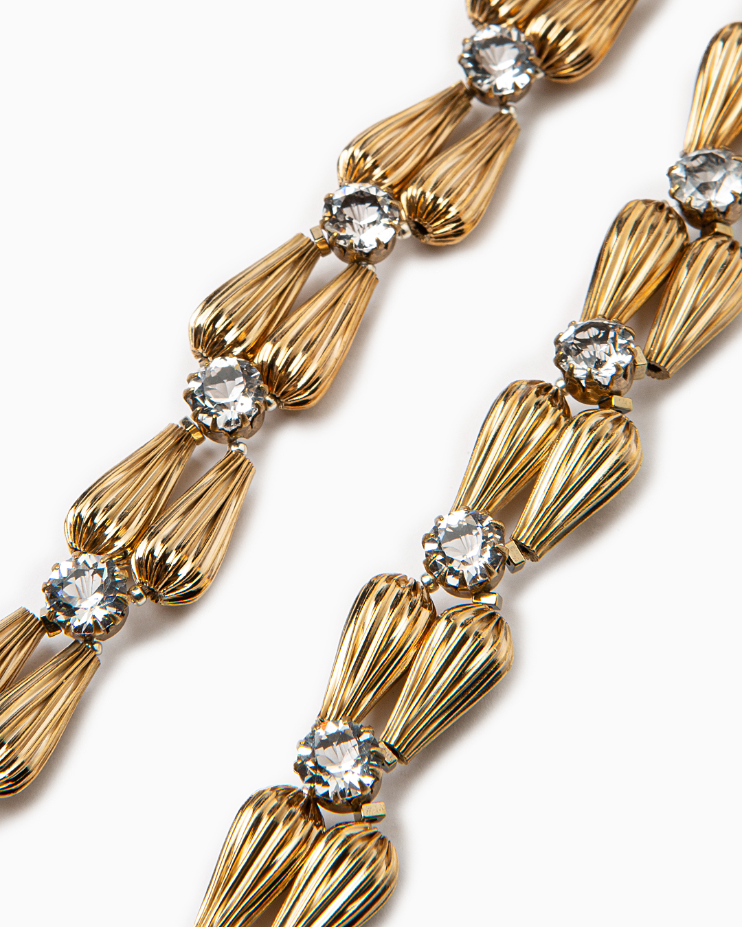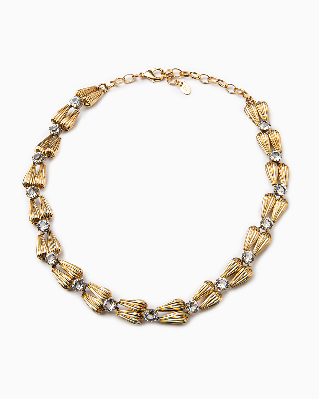 Collier caratterizzato da una simmetria di gocce metalliche insieme a piccoli tondi di cristallo. Impreziosito da schegge di ematite. Tutti i materiali sono anallergici e nickel free. Produzione artigianale italiana.