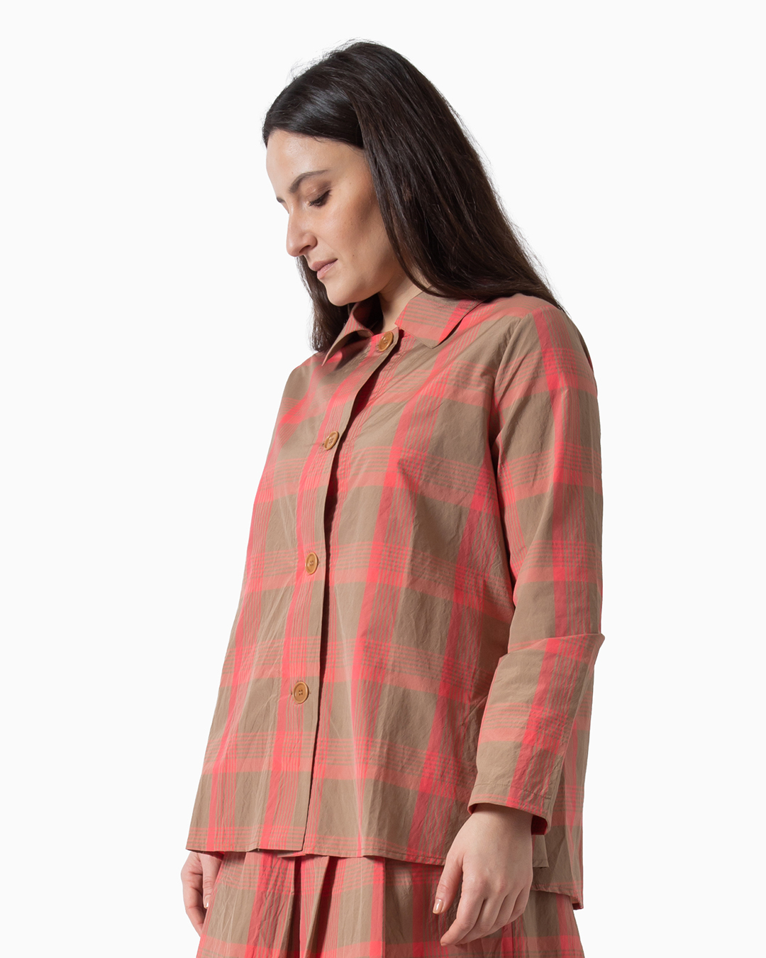 Giacca con stampa check sui toni del rosa corallo e del beige. Taglio ampio e svasato. Tasche laterali e chiusura frontale con bottoni. Composizione: 80% cotone, 10% lino, 10% poliammide. Made in Italy.
